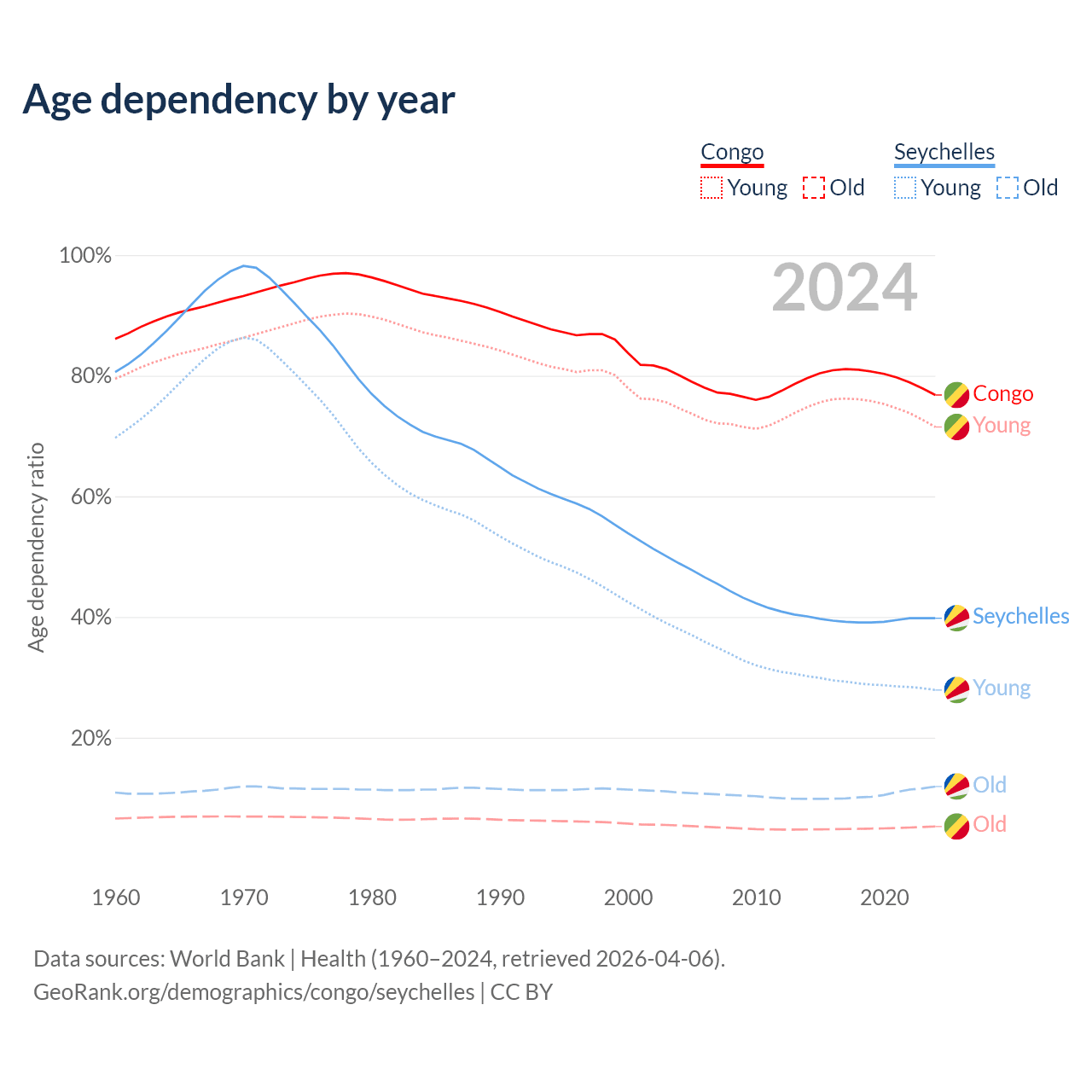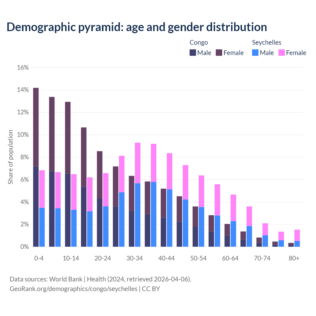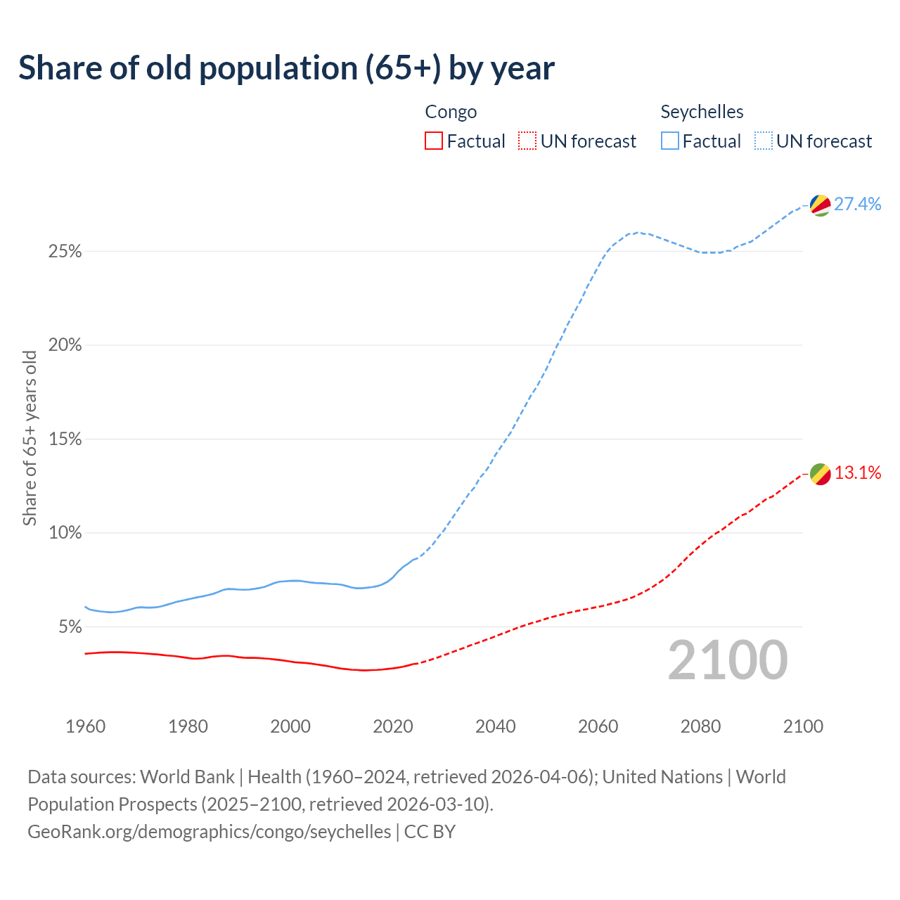 - The share of old-age demographic (65+) in the Congo is 2.99% vs 8.54% in the Seychelles.