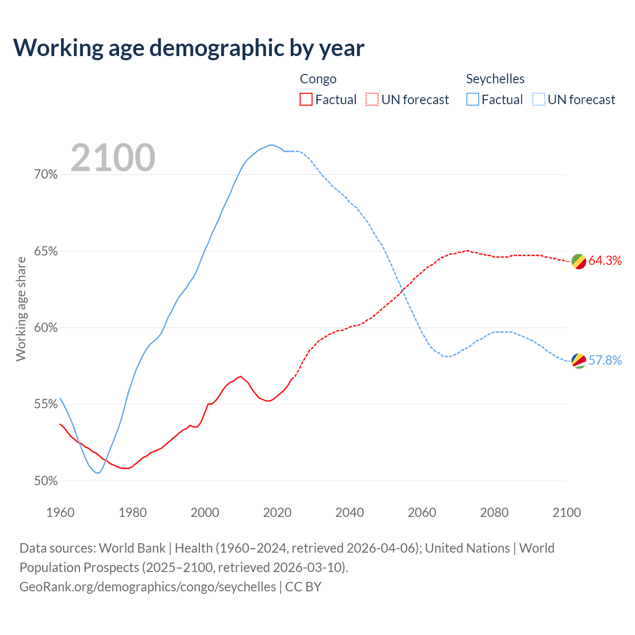 - The Congo has 3.78M working age adults (aged 15-64) vs 90.3K in the Seychelles.