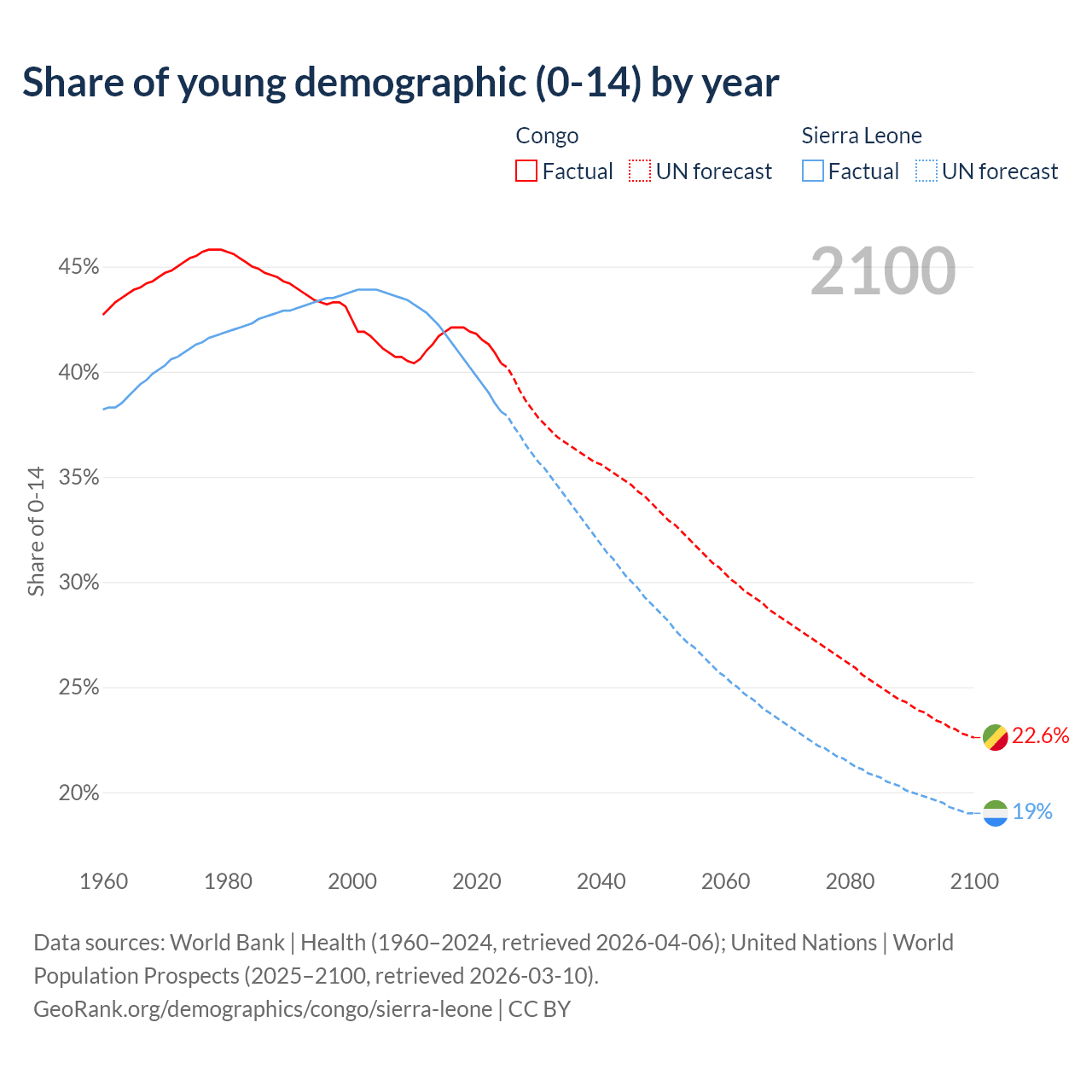 - The share of young demographic (0-15 years old) in the Congo is 40.4% vs 38.1% in Sierra Leone.