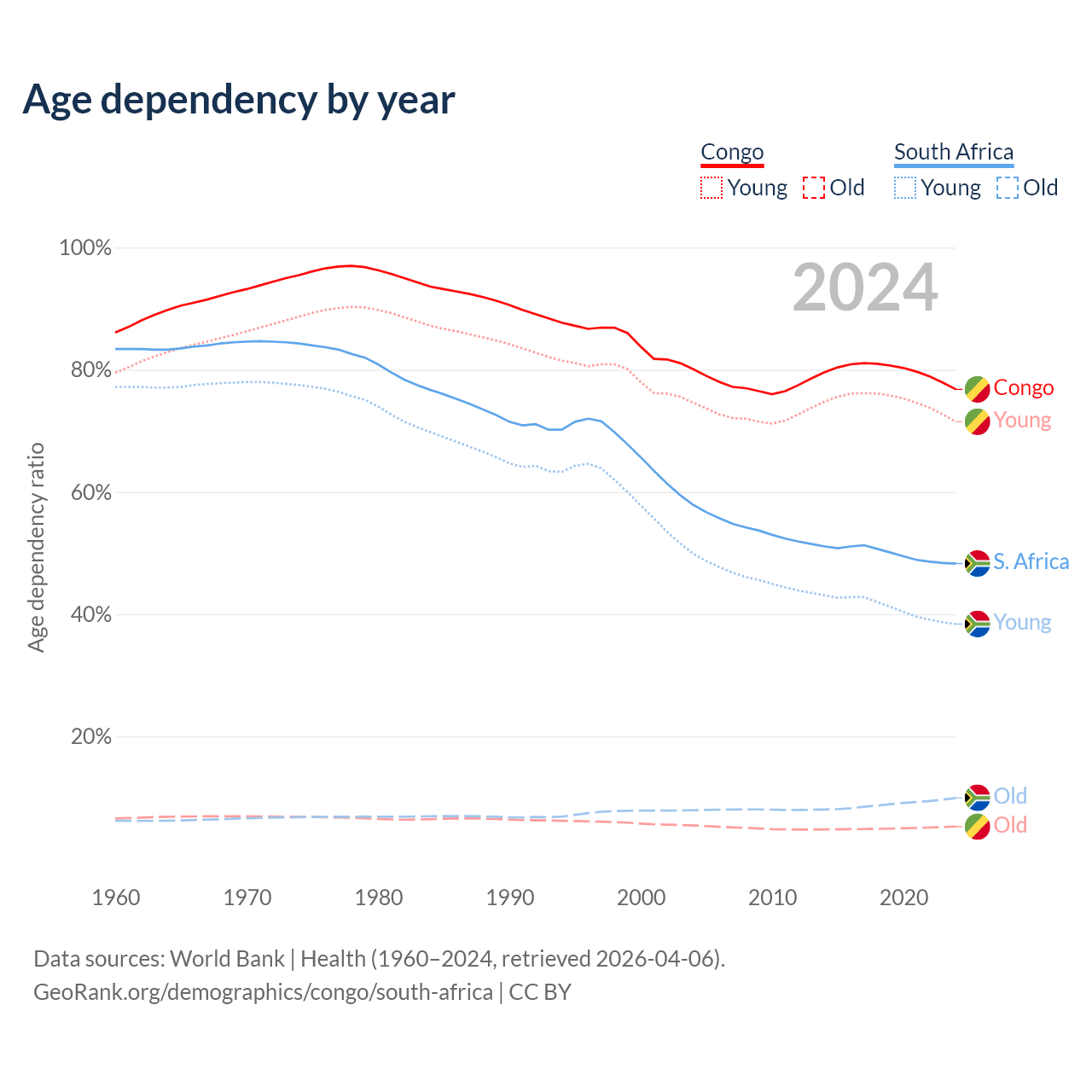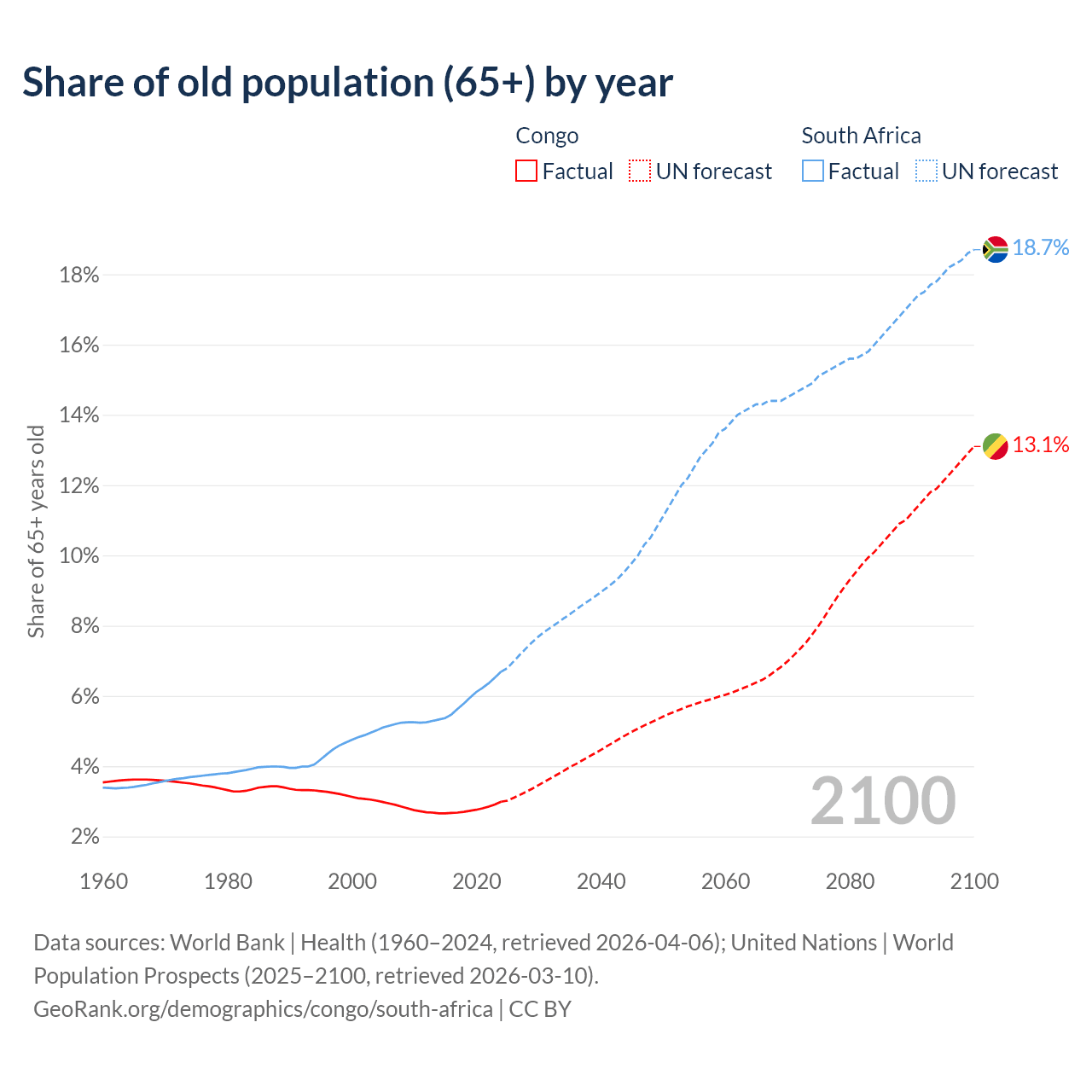 - The share of old-age demographic (65+) in the Congo is 2.99% vs 6.69% in South Africa.