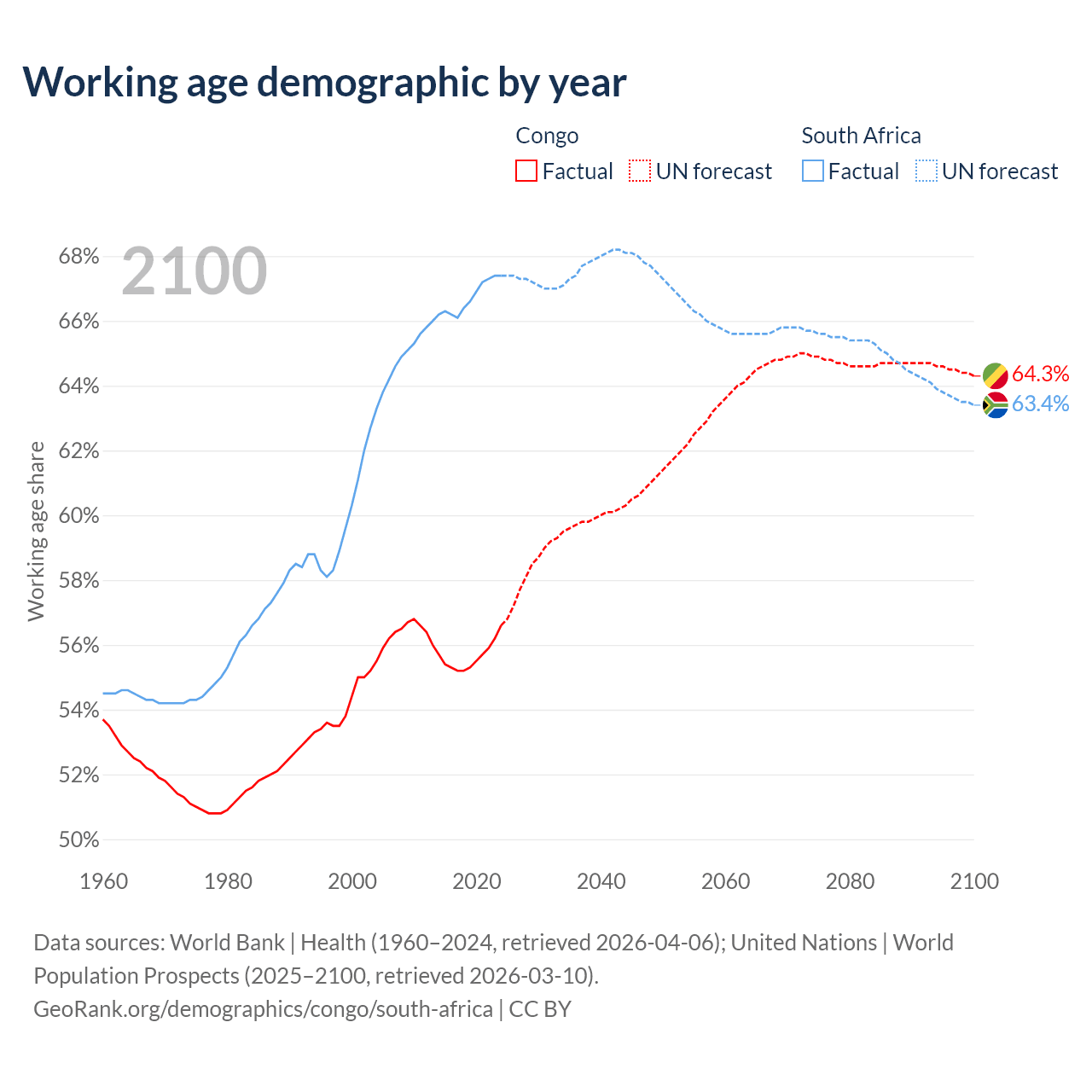 - The Congo has 3.78M working age adults (aged 15-64) vs 44.3M in South Africa.