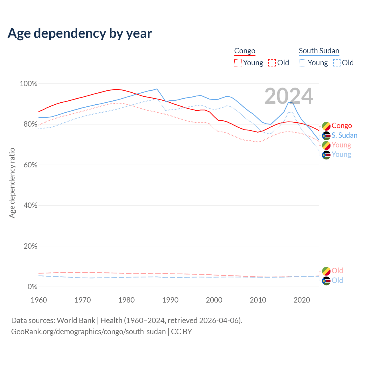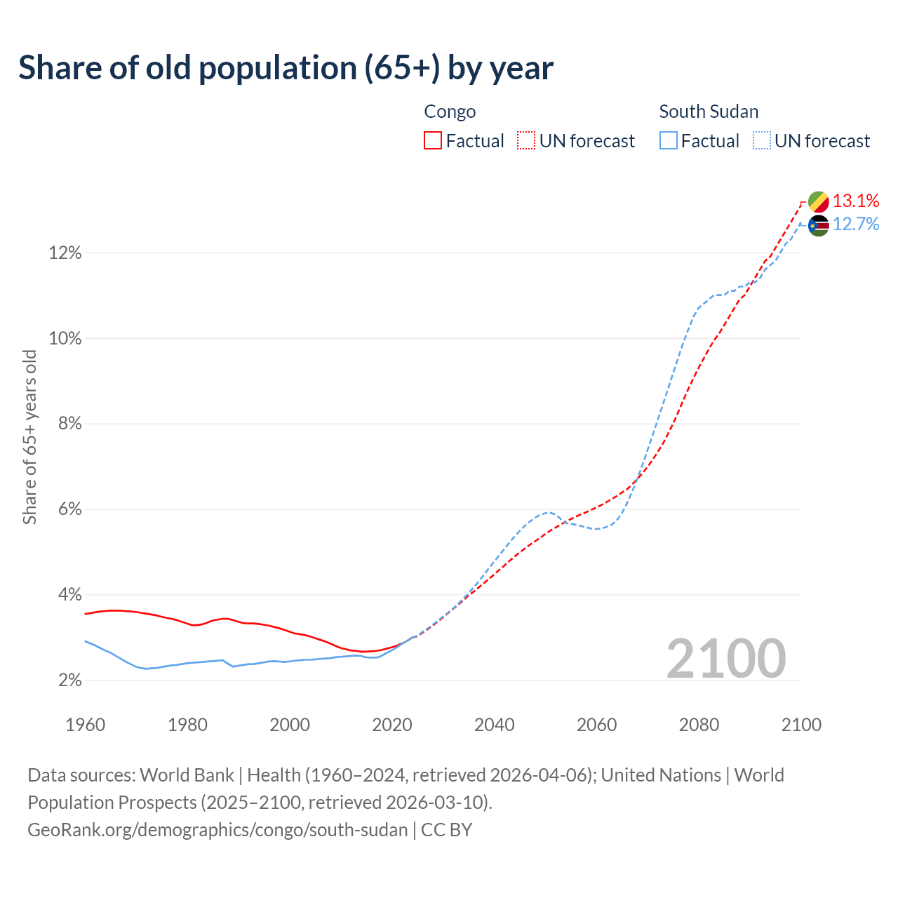 - The share of old-age demographic (65+) in the Congo is 2.99% vs 2.99% in South Sudan.