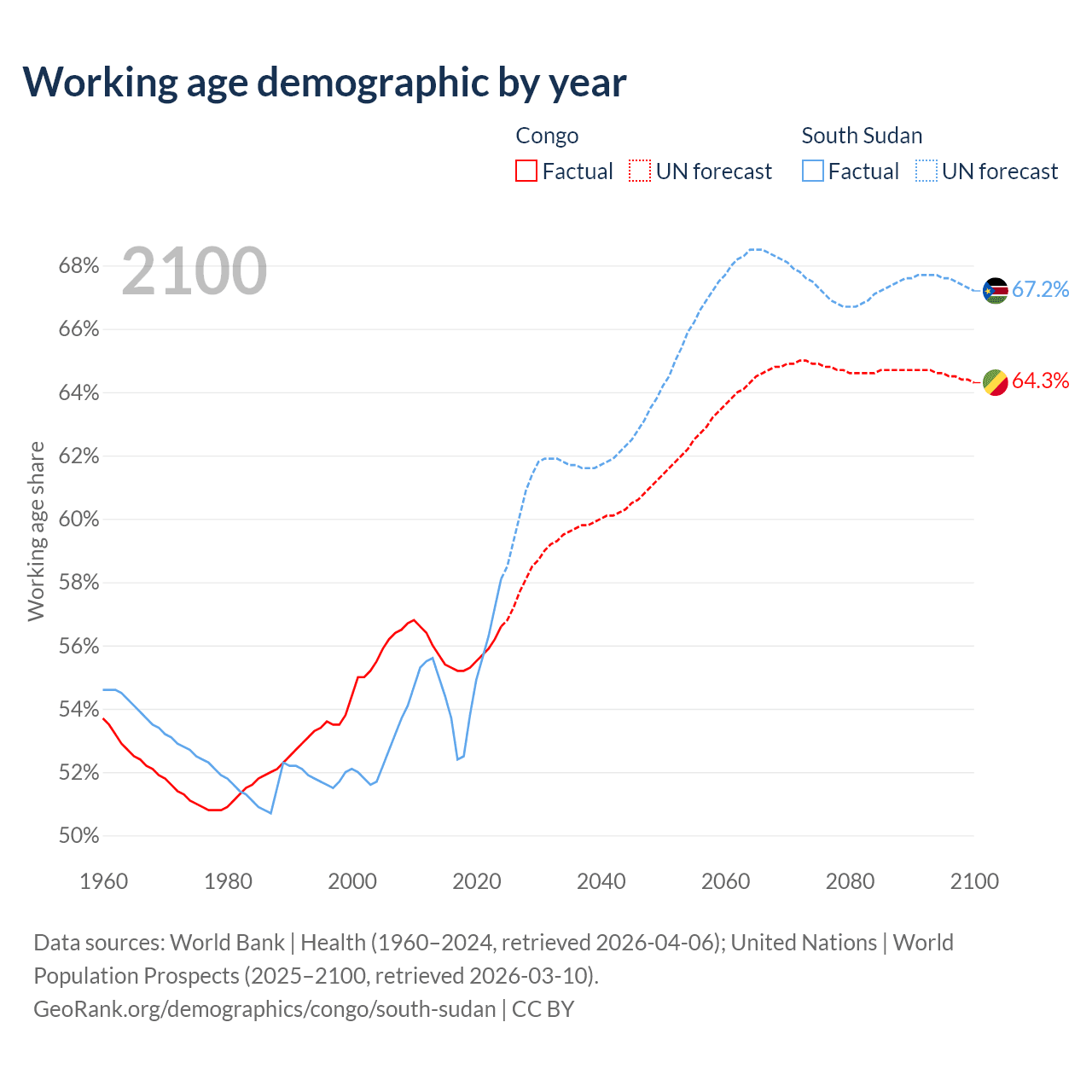 - The Congo has 3.78M working age adults (aged 15-64) vs 7.27M in South Sudan.