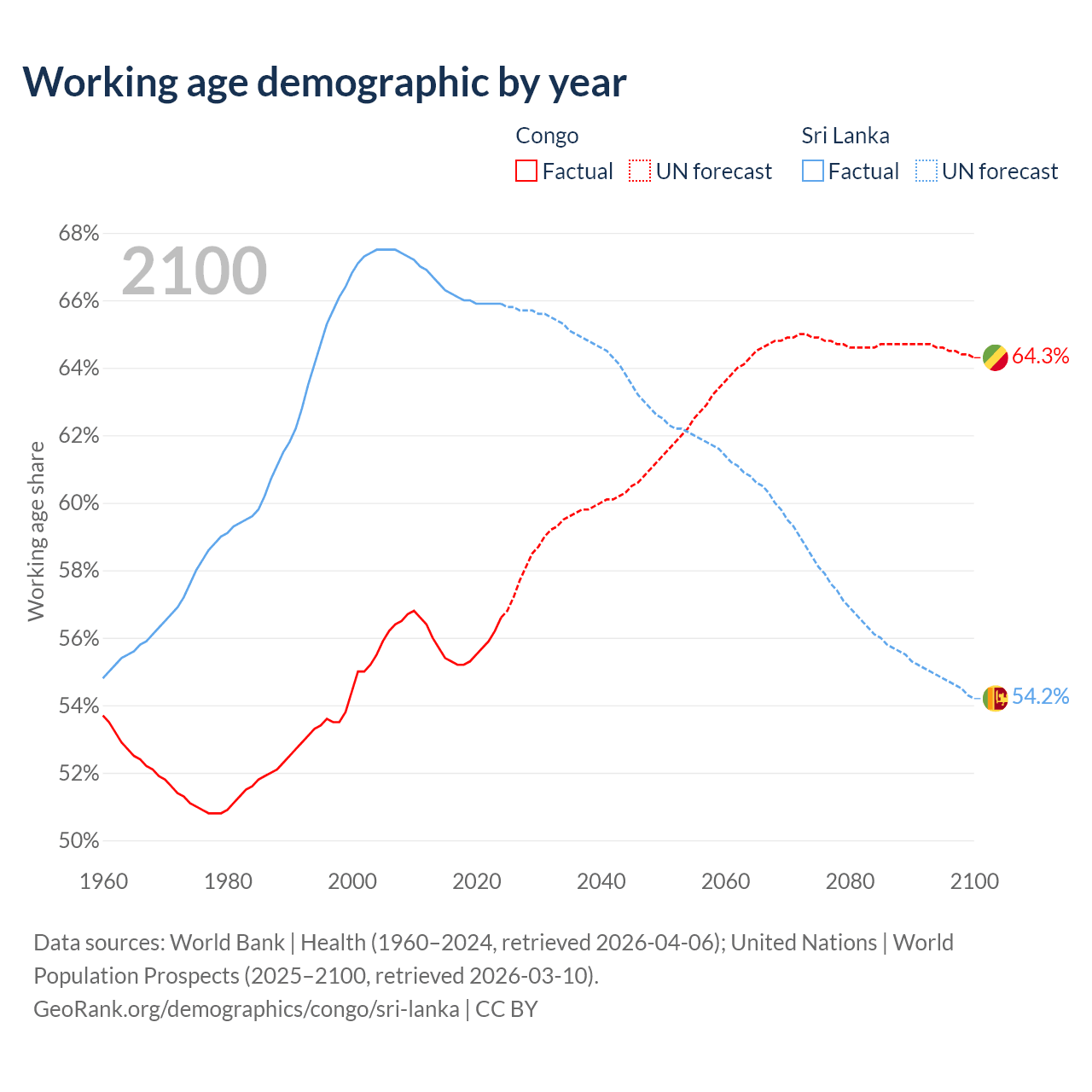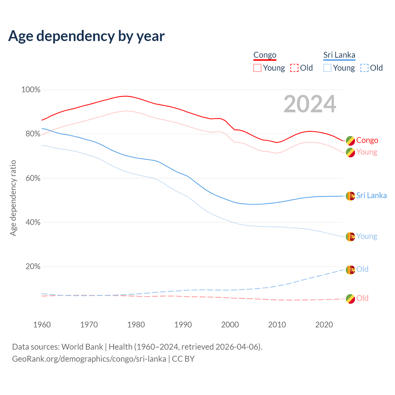 - The share of old-age demographic (65+) in the Congo is 2.99% vs 12.1% in Sri Lanka.