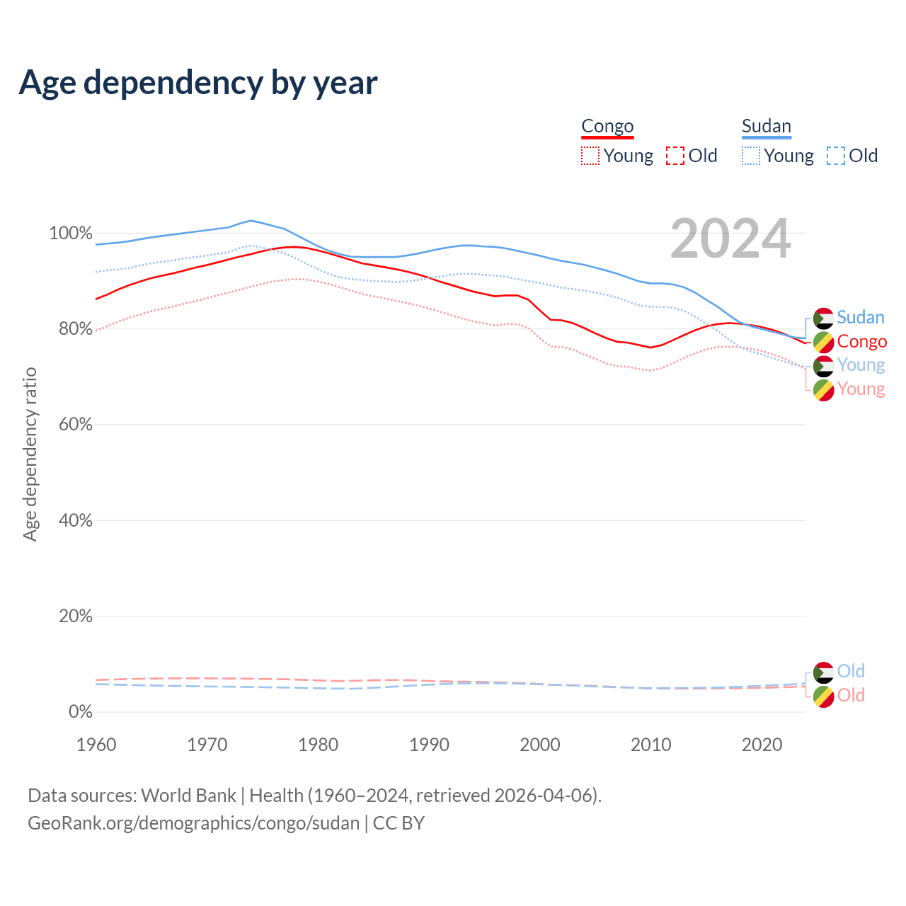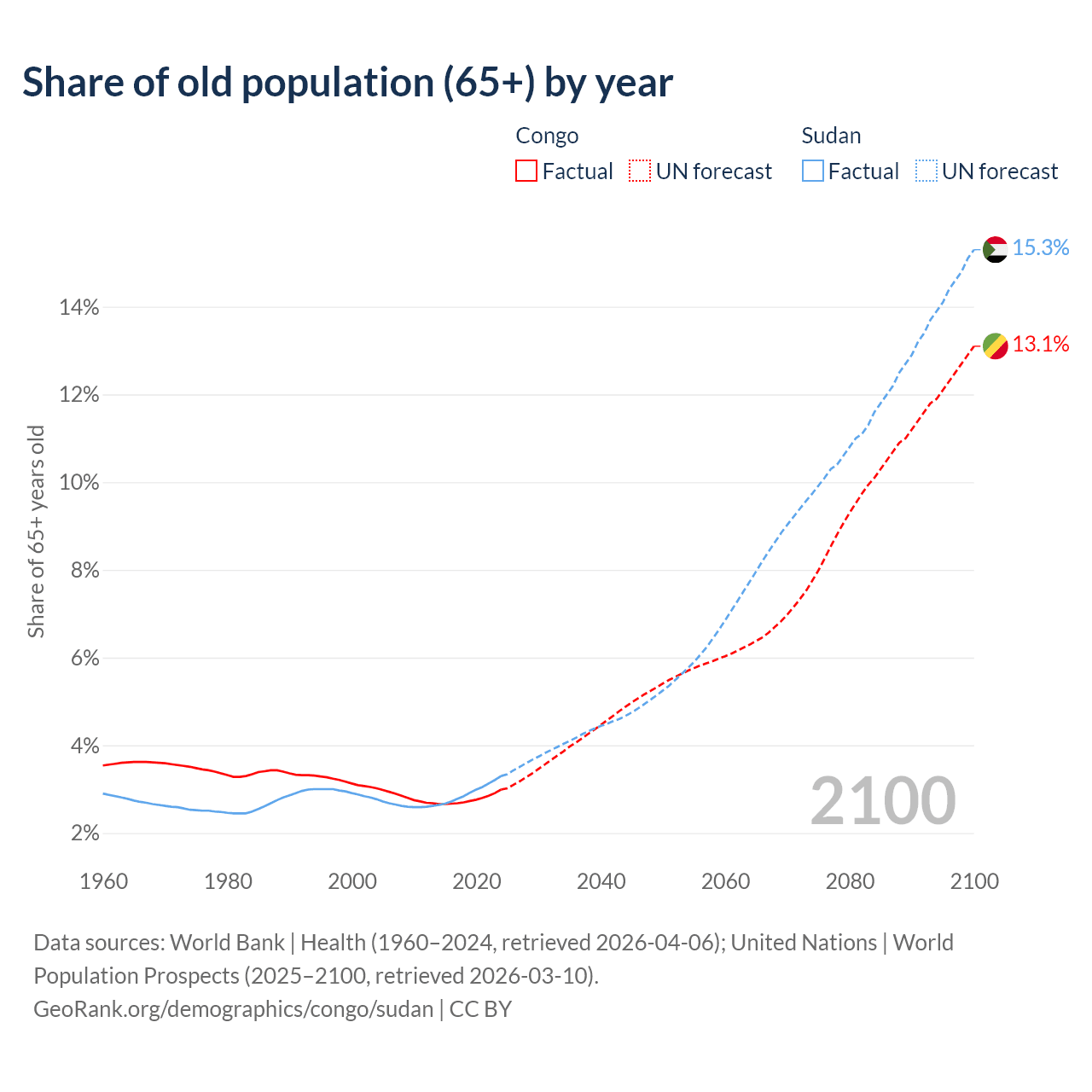 - The share of old-age demographic (65+) in the Congo is 2.99% vs 3.3% in Sudan.