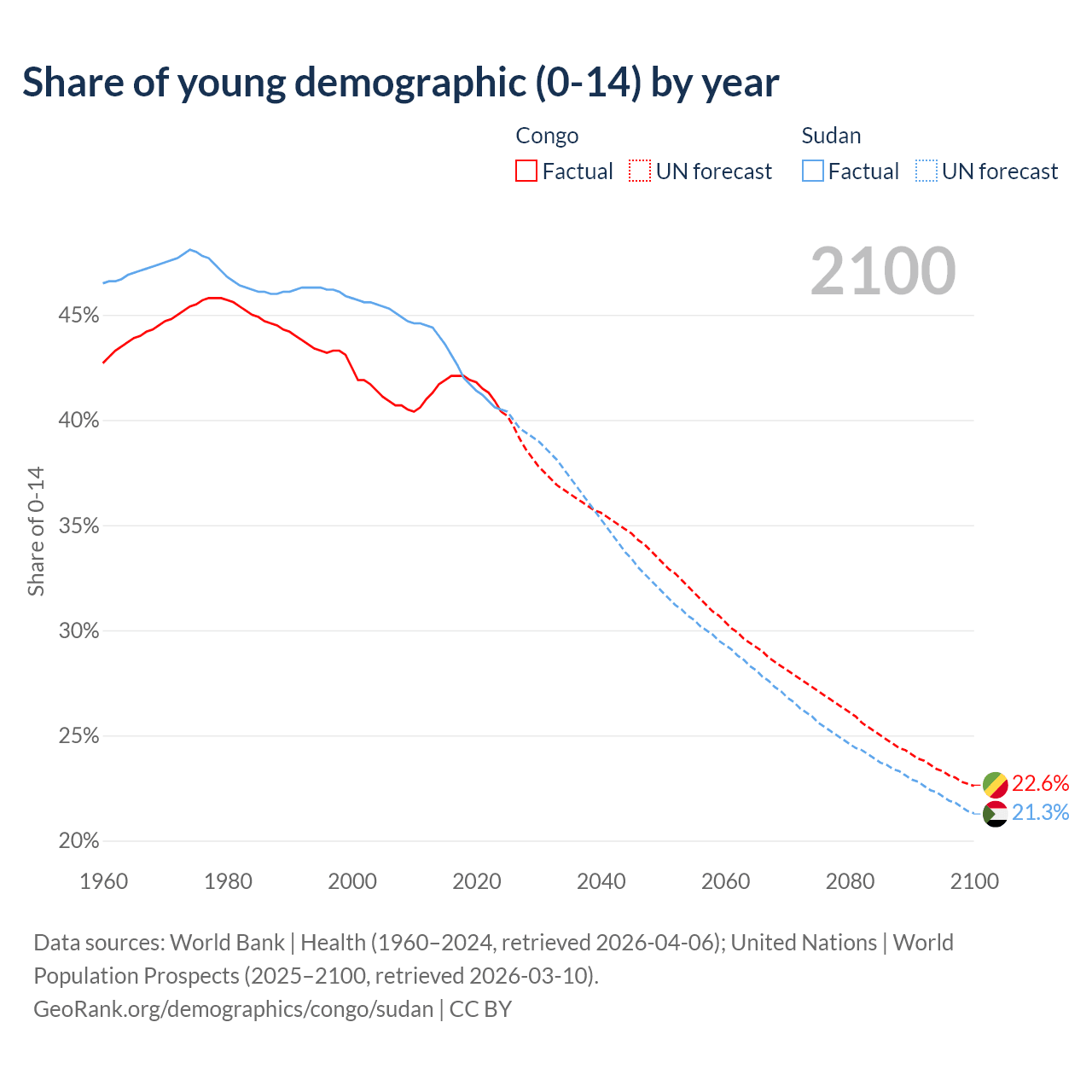 - The share of young demographic (0-15 years old) in the Congo is 40.4% vs 40.5% in Sudan.