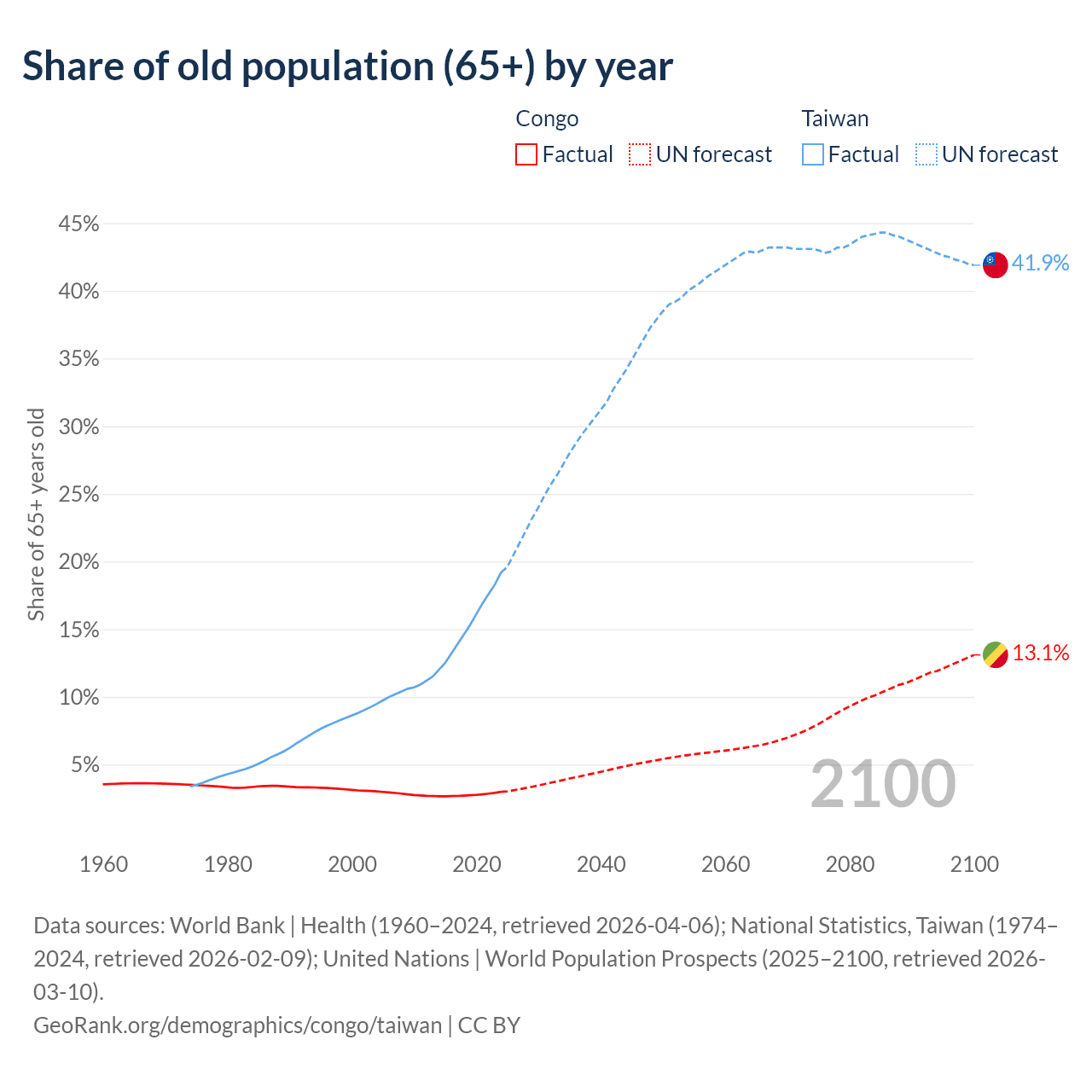 - The share of old-age demographic (65+) in the Congo is 2.99% vs 19.2% in Taiwan.