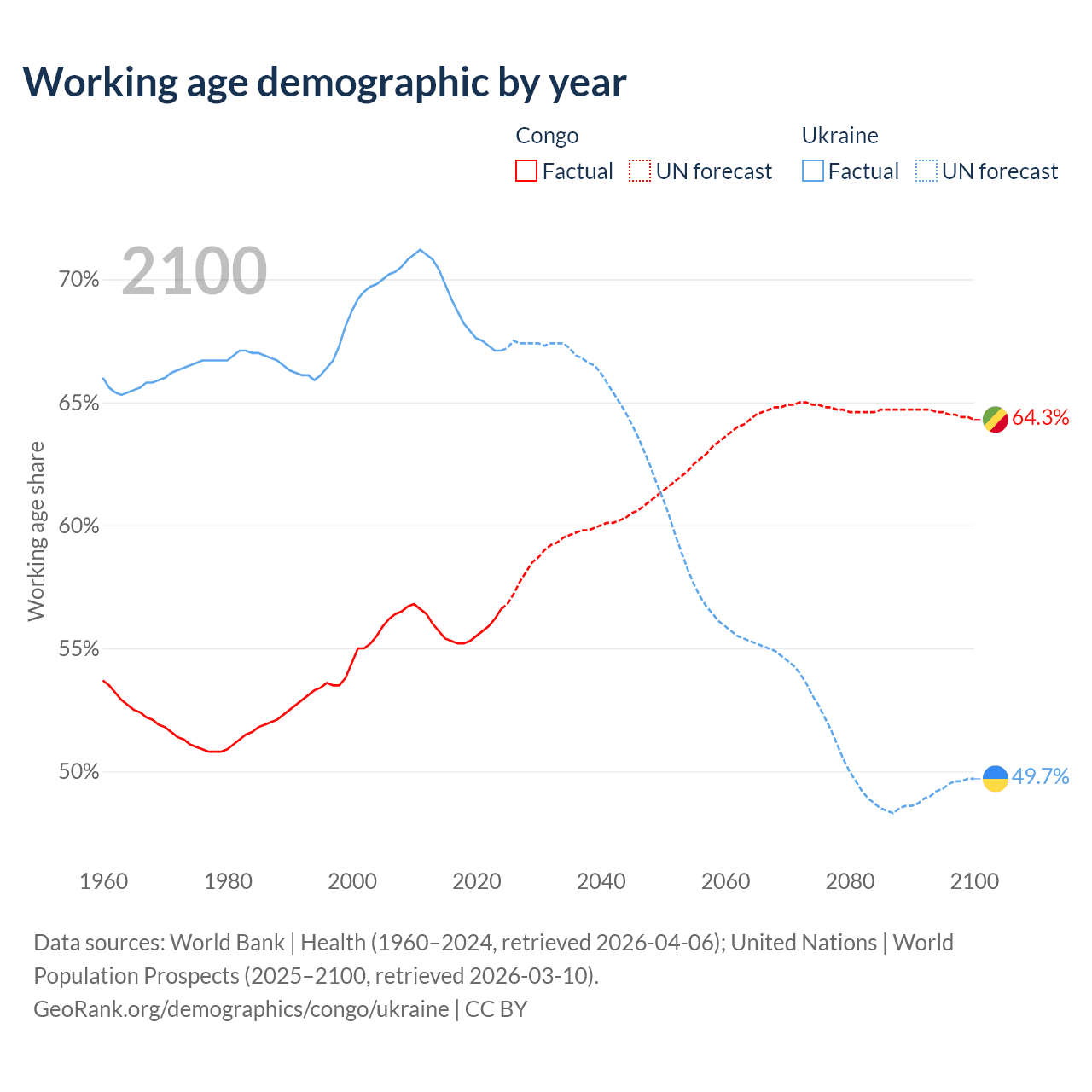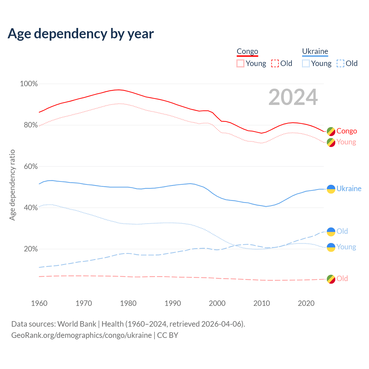 - The share of old-age demographic (65+) in the Congo is 2.99% vs 19% in Ukraine.