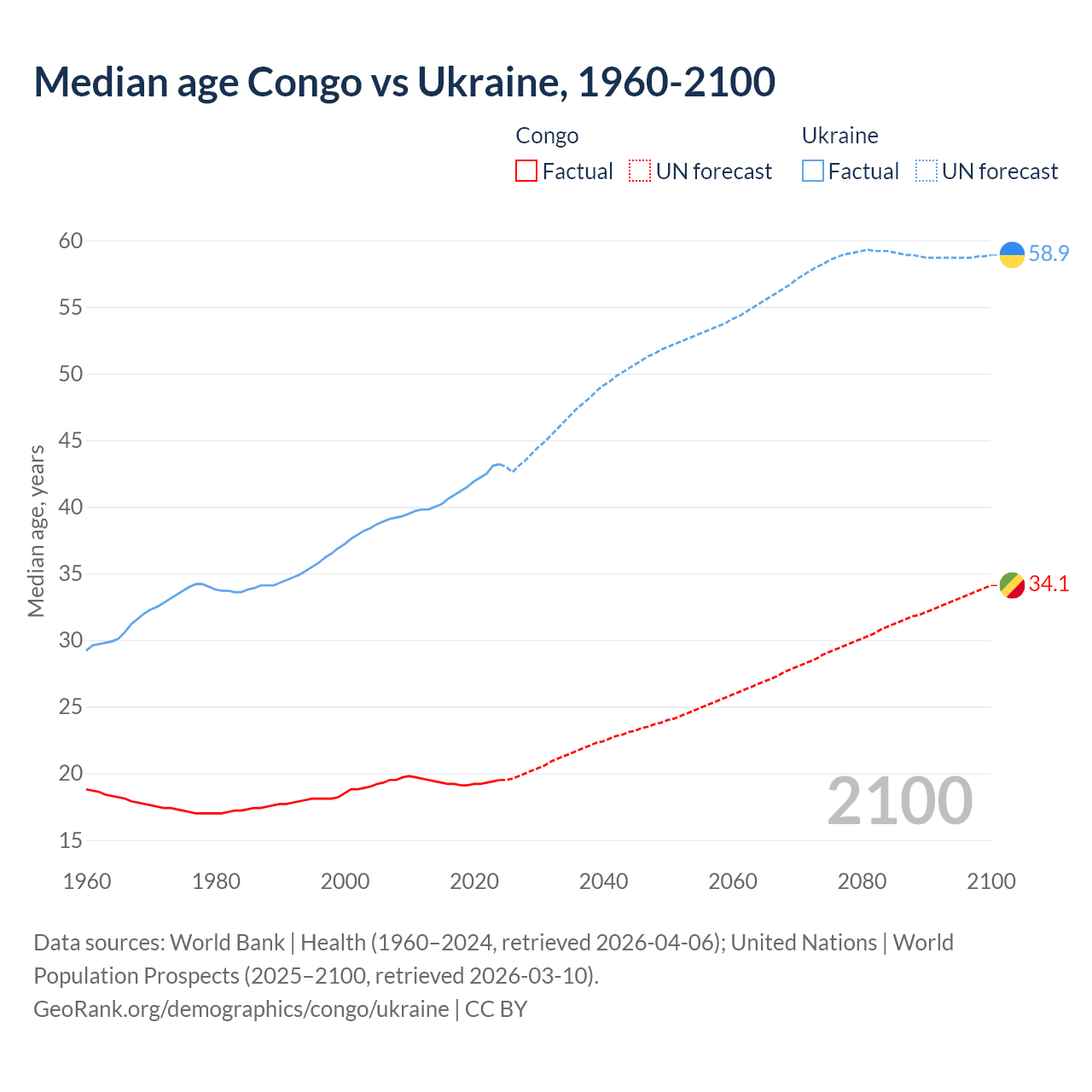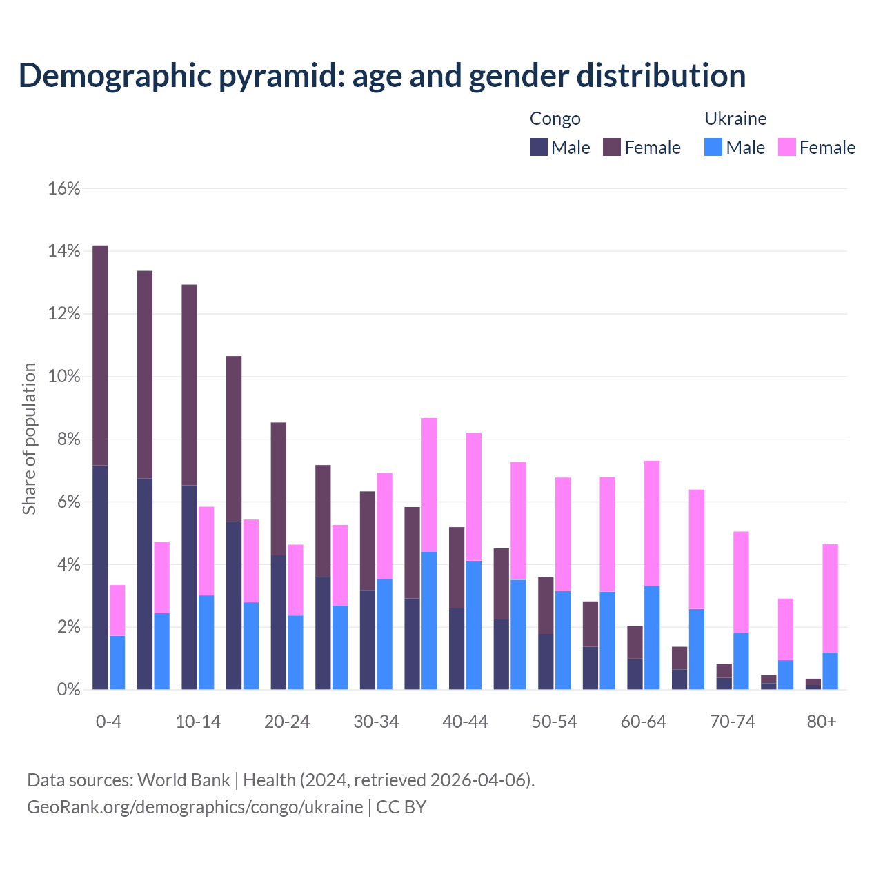 - The Congo is ranked 170/196 by median age (oldest to youngest) vs 26/196 for Ukraine.