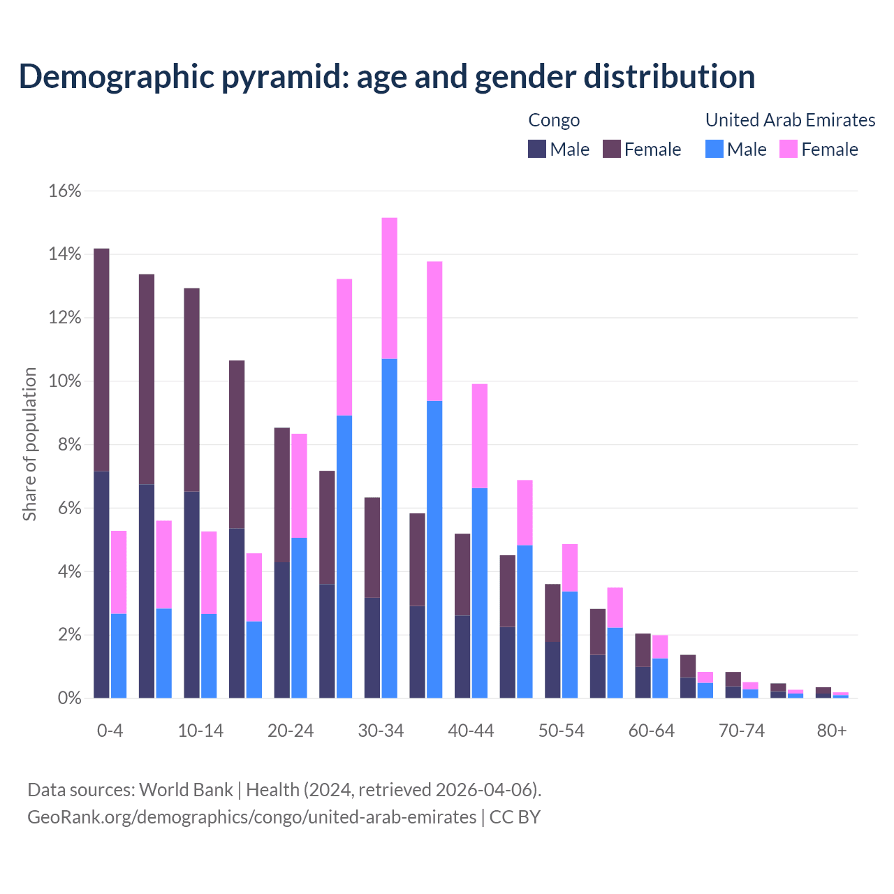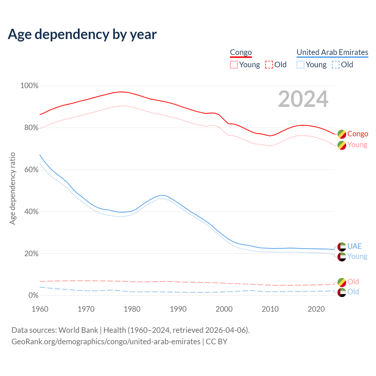 - The share of old-age demographic (65+) in the Congo is 2.99% vs 1.77% in the United Arab Emirates.