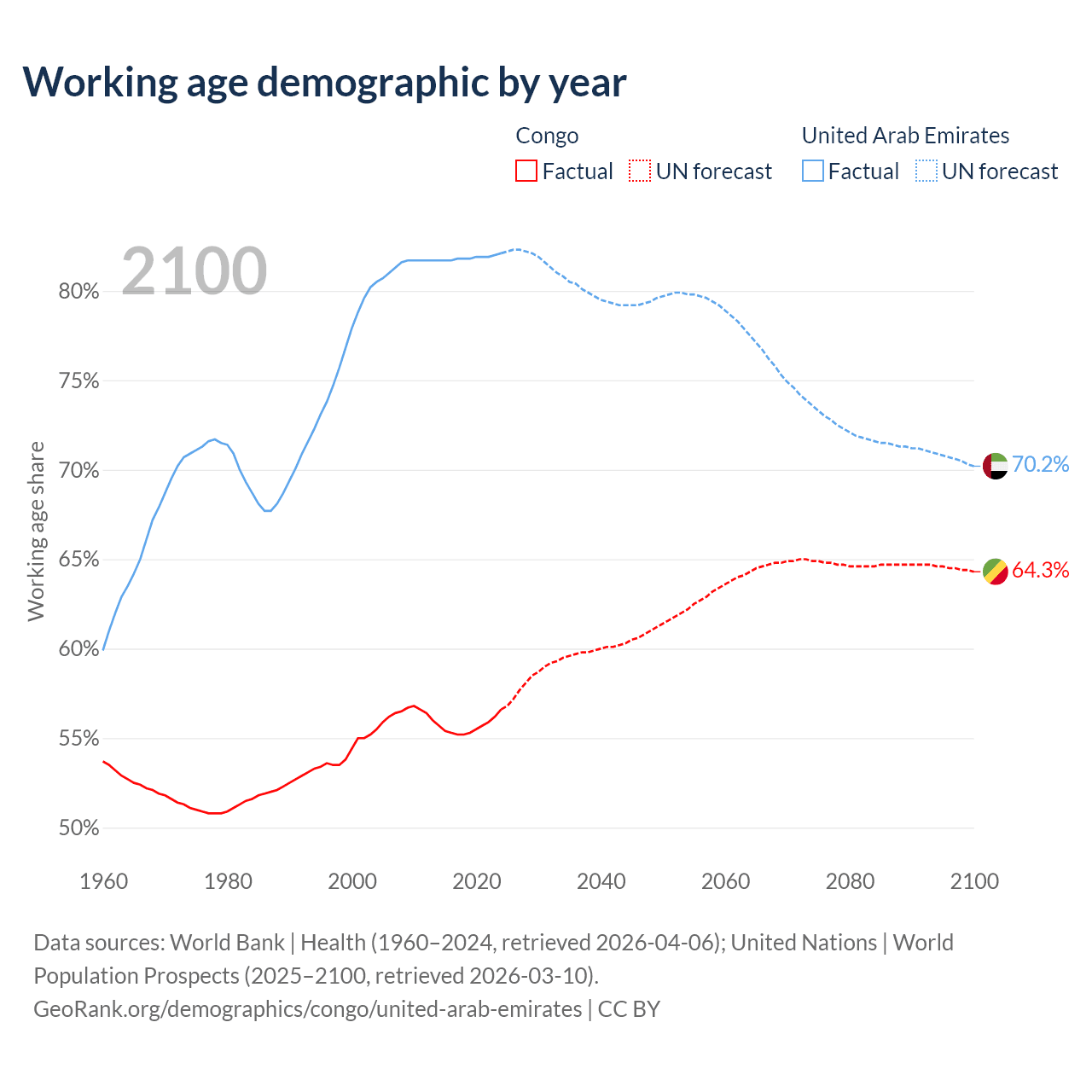 - The Congo has 3.78M working age adults (aged 15-64) vs 9.6M in the United Arab Emirates.