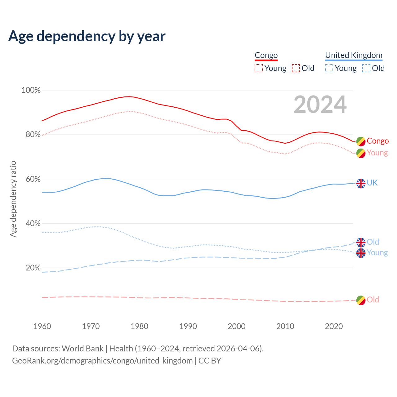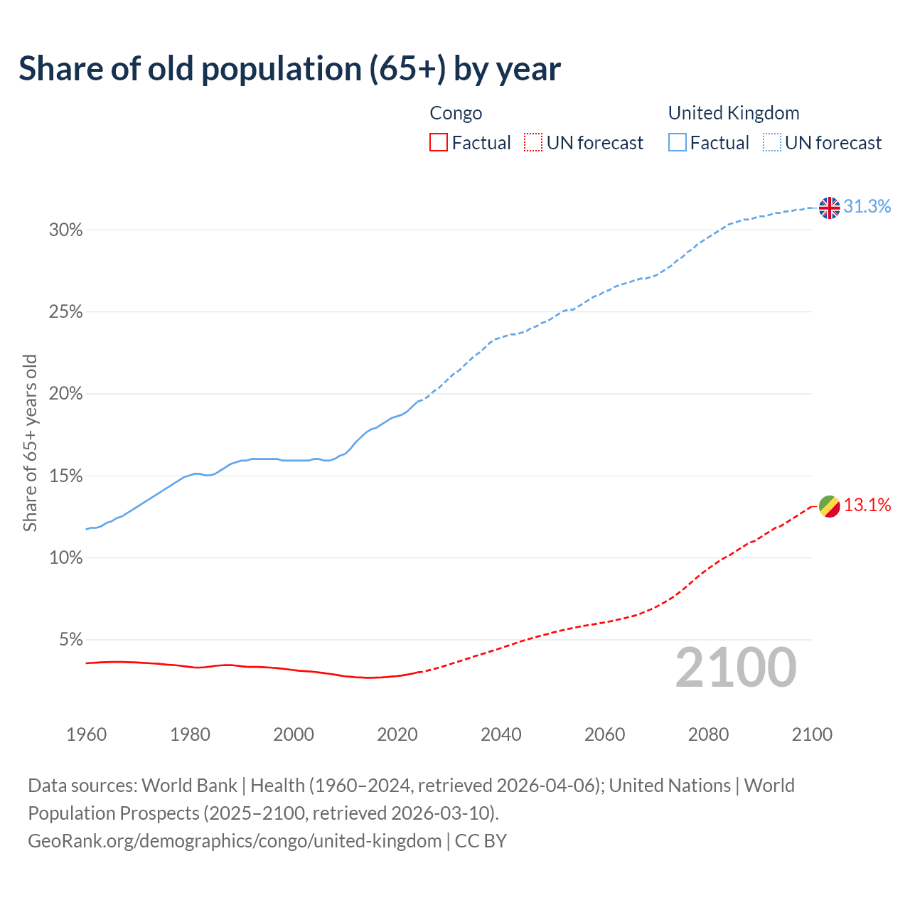 - The share of old-age demographic (65+) in the Congo is 2.99% vs 19.5% in the United Kingdom.