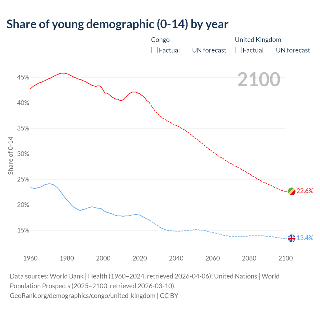 - The share of young demographic (0-15 years old) in the Congo is 40.4% vs 17.2% in the United Kingdom.
