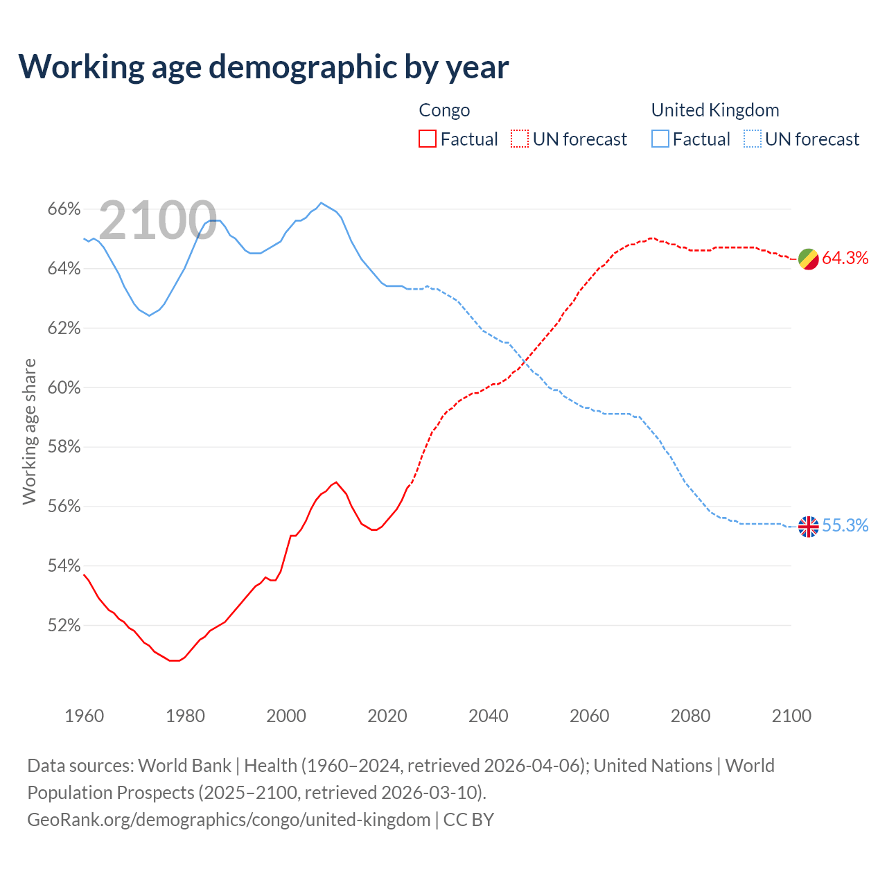 Median age Congo vs United Kingdom, 1960-2100