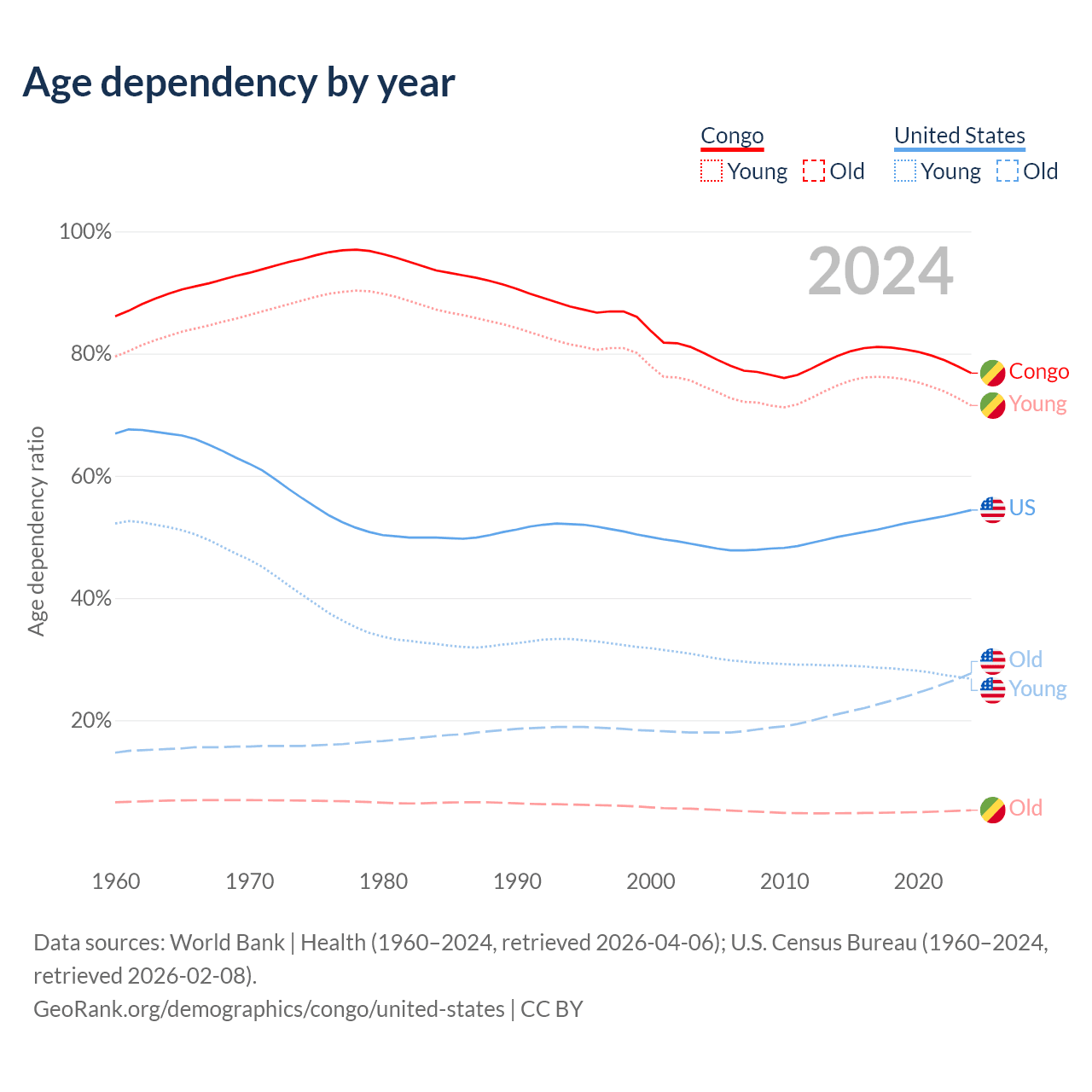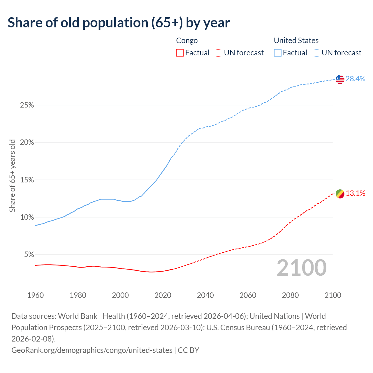 - The share of old-age demographic (65+) in the Congo is 2.99% vs 17.9% in the United States.