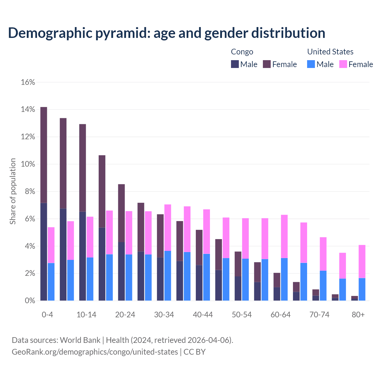 - The Congo is ranked 170/196 by median age (oldest to youngest) vs 50/196 for the United States.