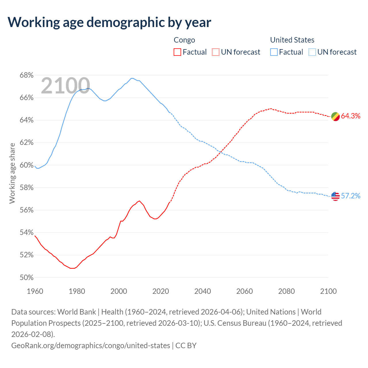 - The Congo has 3.78M working age adults (aged 15-64) vs 223M in the United States.