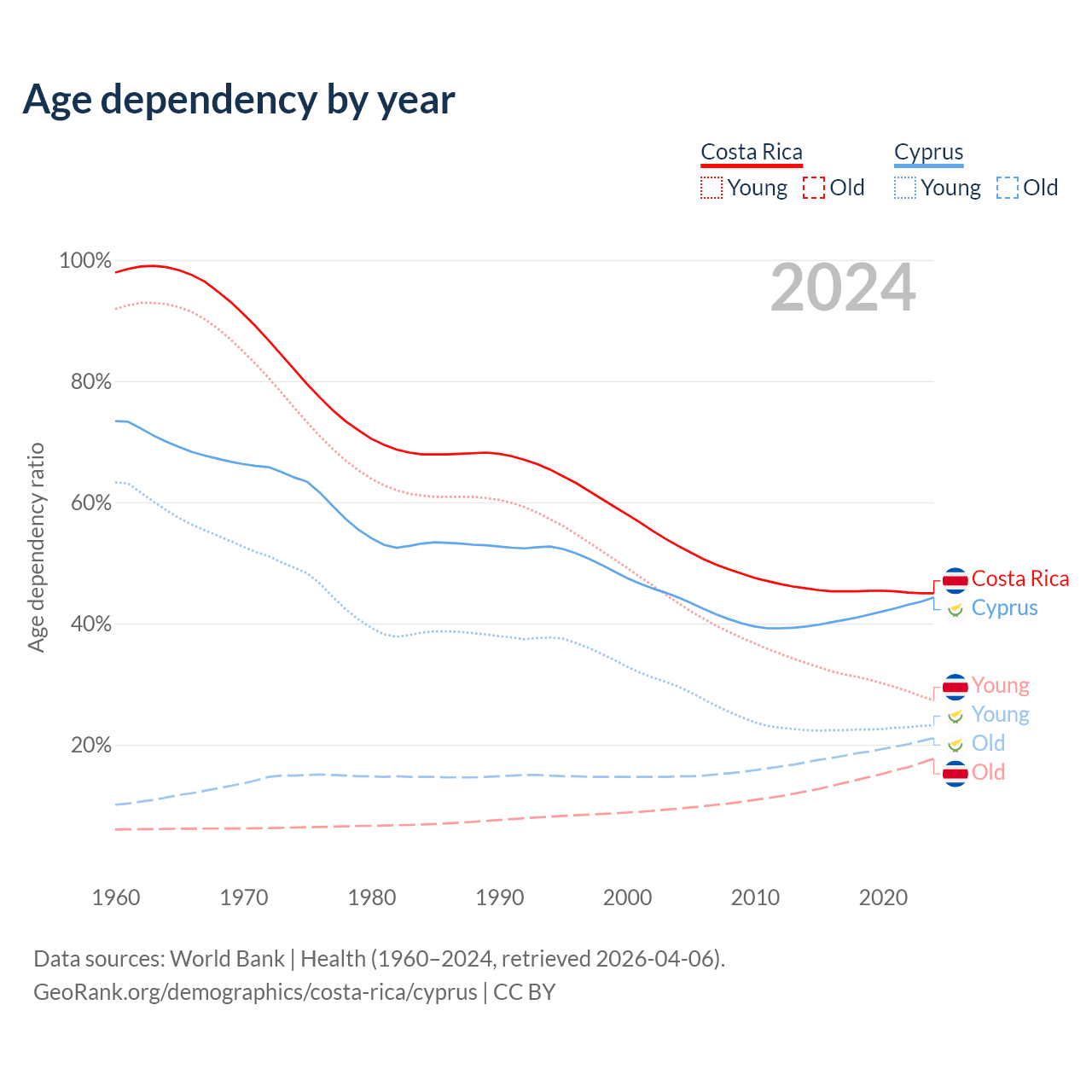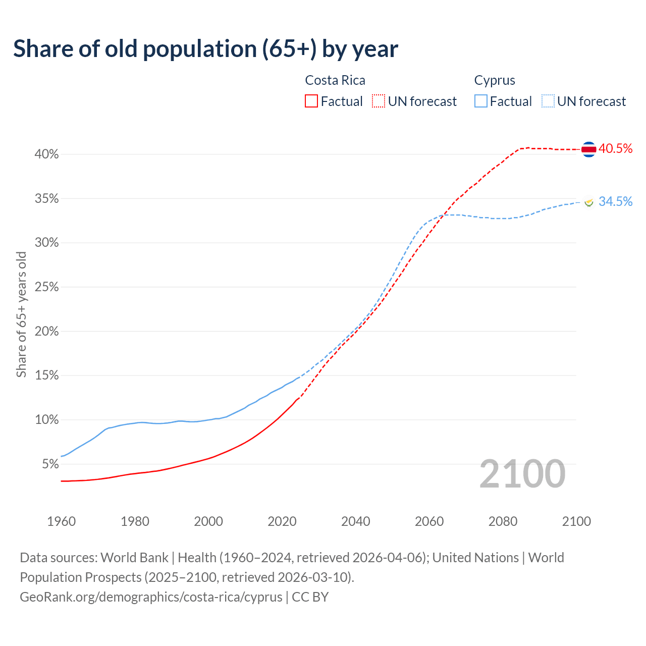 The share of older people aged 65 and over is 12.2% in Costa Rica and 14.6% in Cyprus. Life expectancy in Costa Rica compared to Cyprus .
