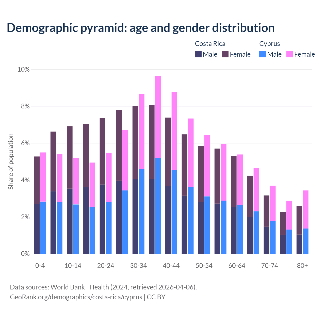 - Costa Rica is ranked 72/196 by median age (oldest to youngest) vs 52/196 for Cyprus.