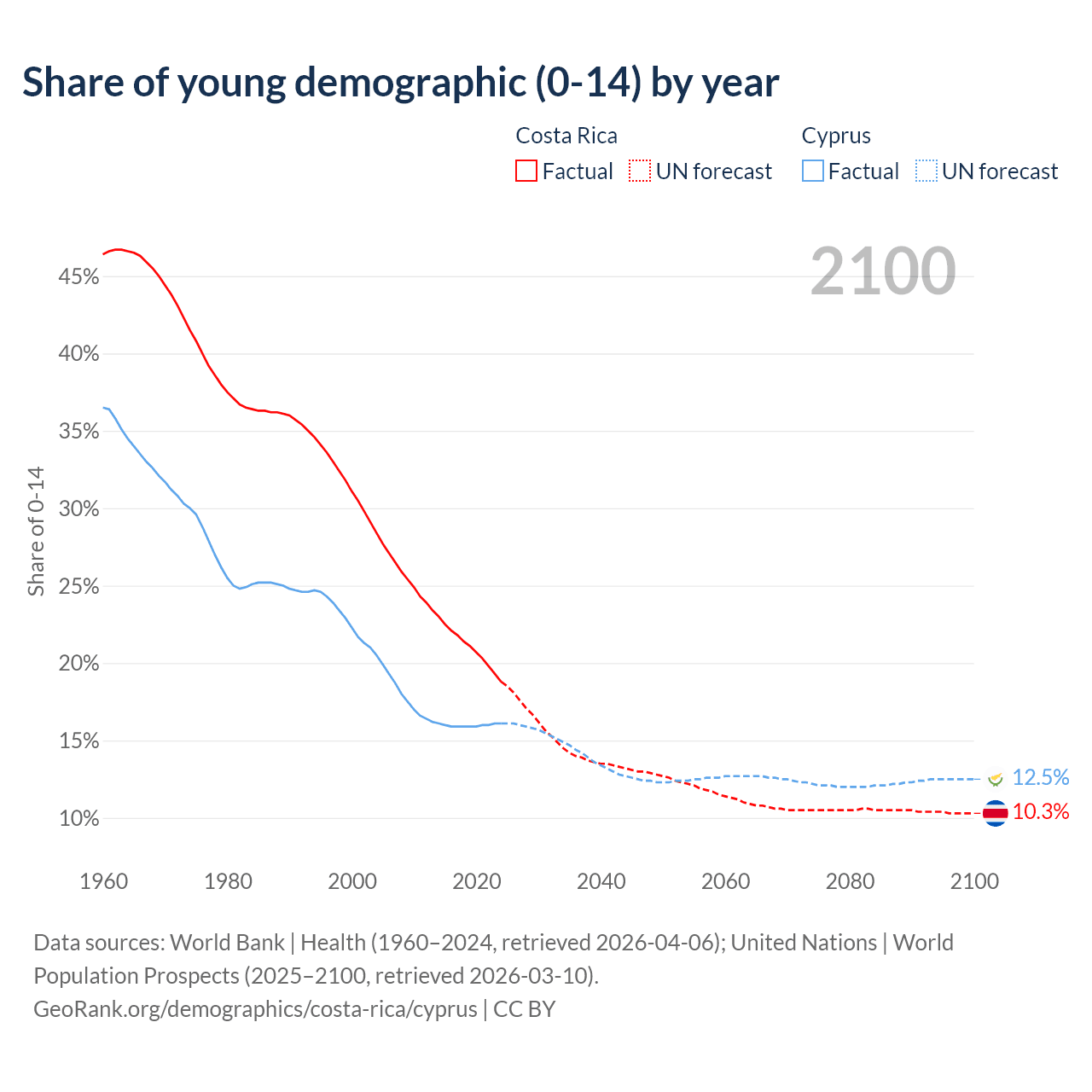 - The share of young demographic (0-15 years old) in Costa Rica is 18.8% vs 16.1% in Cyprus.