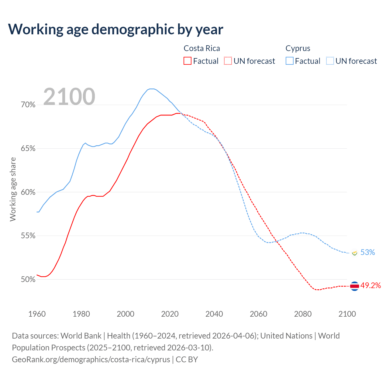- Costa Rica has 3.57M working age adults (aged 15-64) vs 961K in Cyprus.
