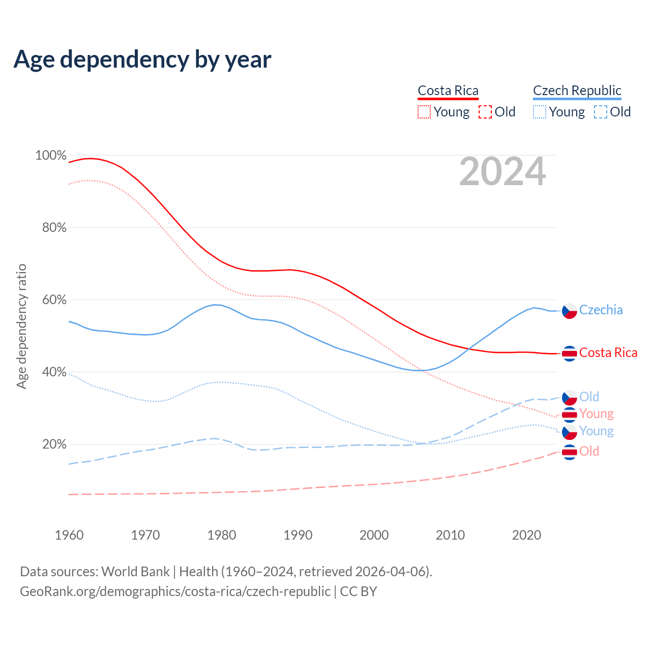 Data sources: World Bank | Health (1960–2024, retrieved 2026-04-06); U.S. Census Bureau (1960–2024, retrieved 2026-02-08).