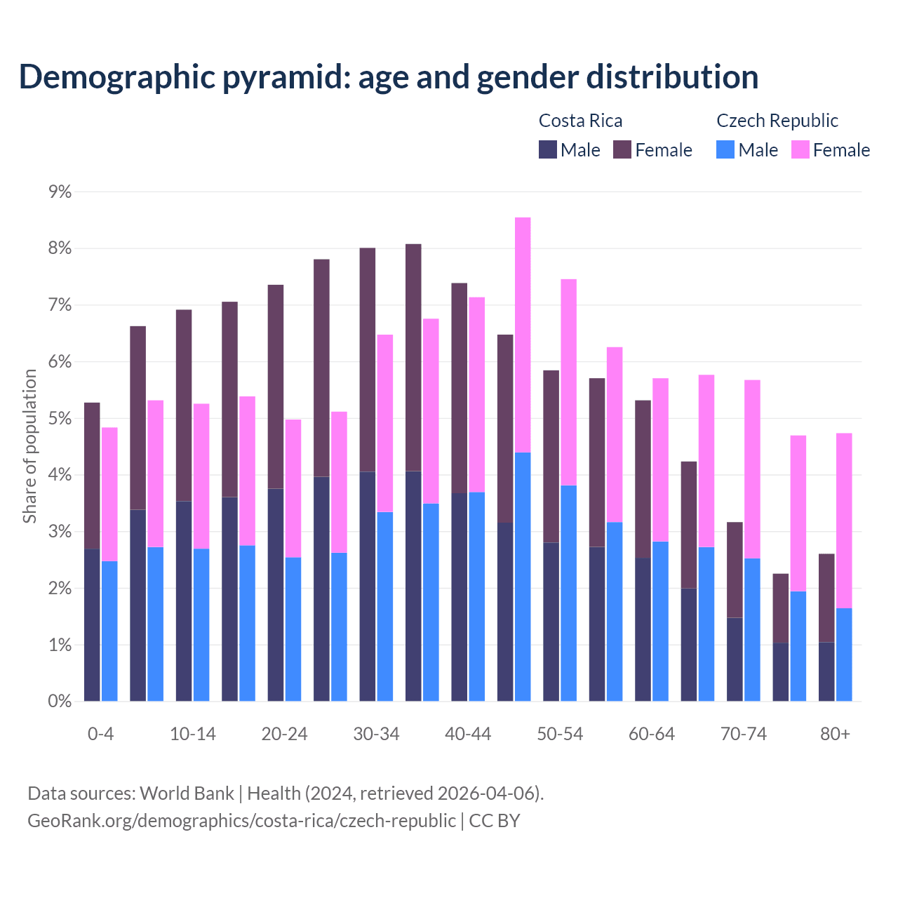 The share of older people aged 65 and over is 12.2% in Costa Rica and 20.8% in the Czech Republic. Life expectancy in Costa Rica compared to the Czech Republic .