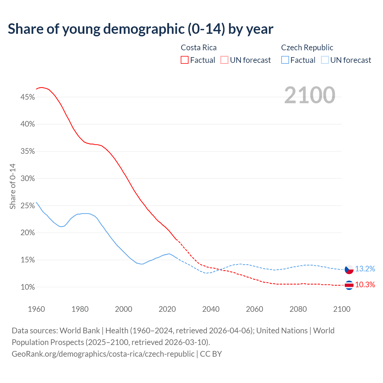 - The share of young demographic (0-15 years old) in Costa Rica is 18.8% vs 15.4% in the Czech Republic.