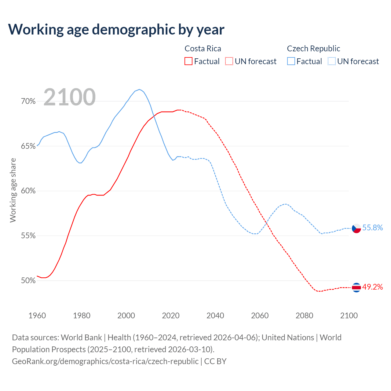Median age Costa Rica vs Czech Republic, 1960-2100