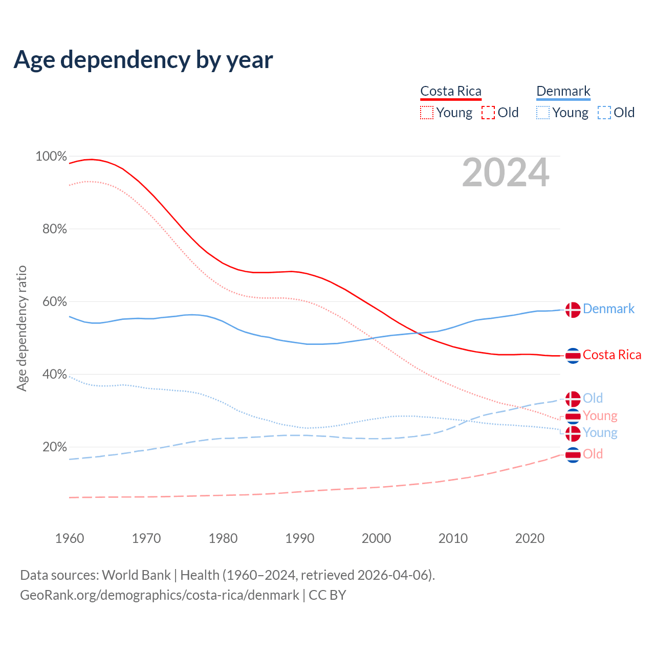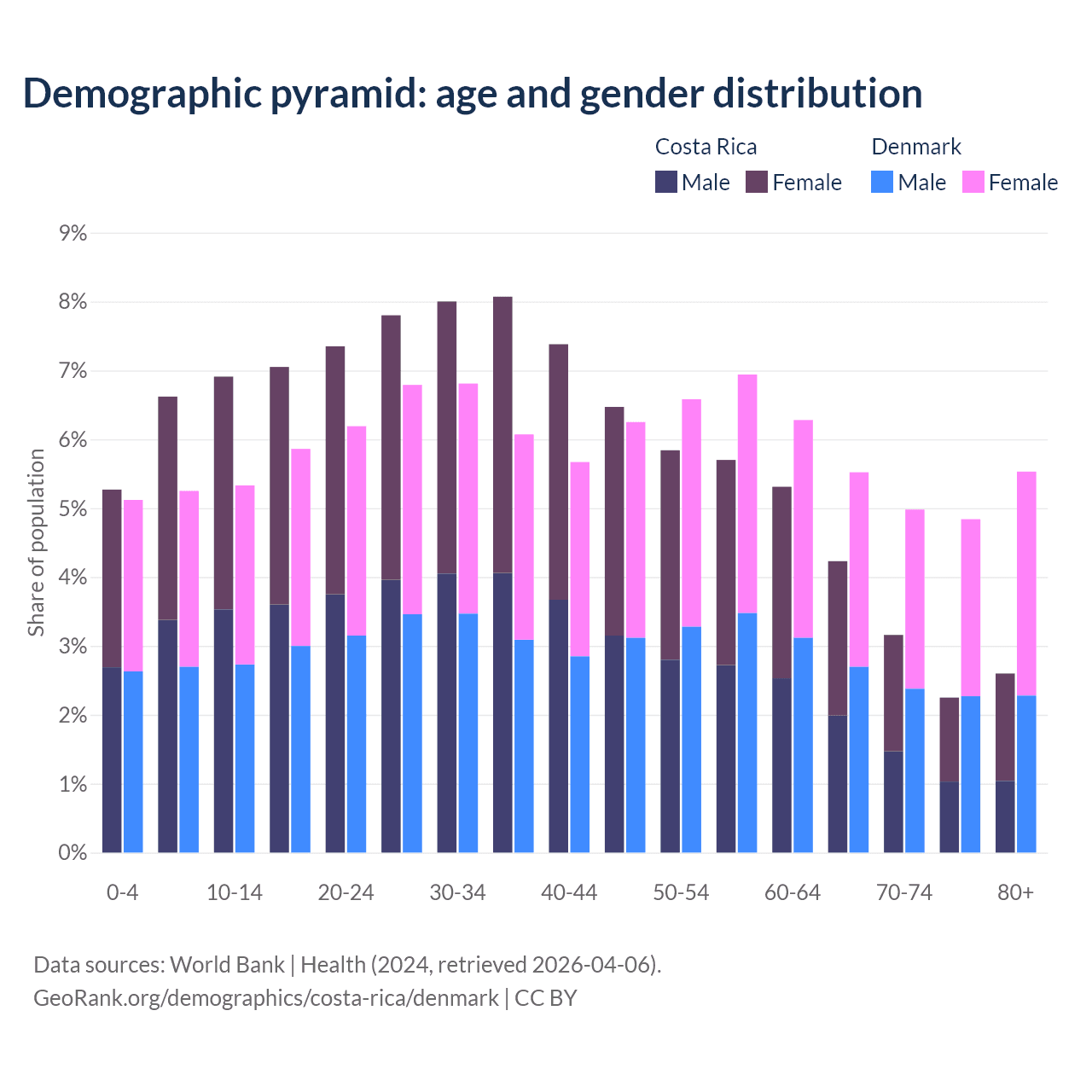 - Costa Rica is ranked 72/196 by median age (oldest to youngest) vs 34/196 for Denmark.