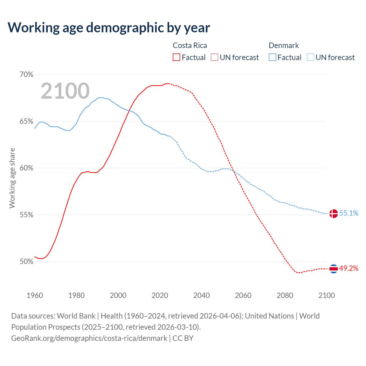 Median age Costa Rica vs Denmark, 1960-2100