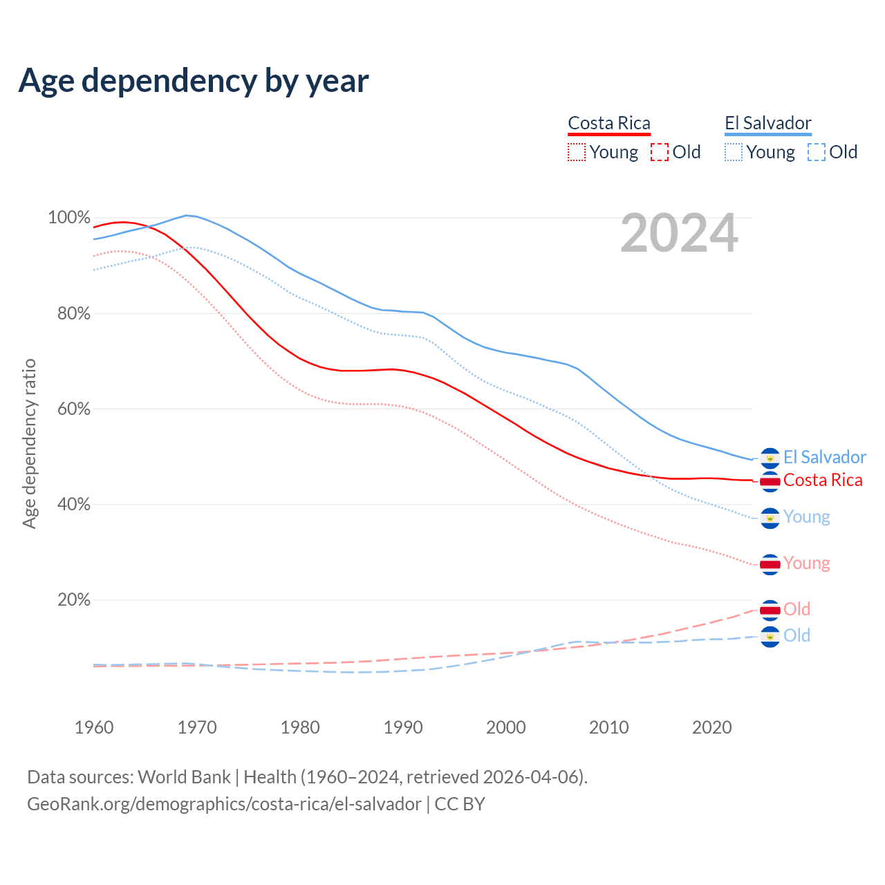 Data sources: World Bank | Health (1960–2024, retrieved 2026-04-06); U.S. Census Bureau (1960–2024, retrieved 2026-02-08).