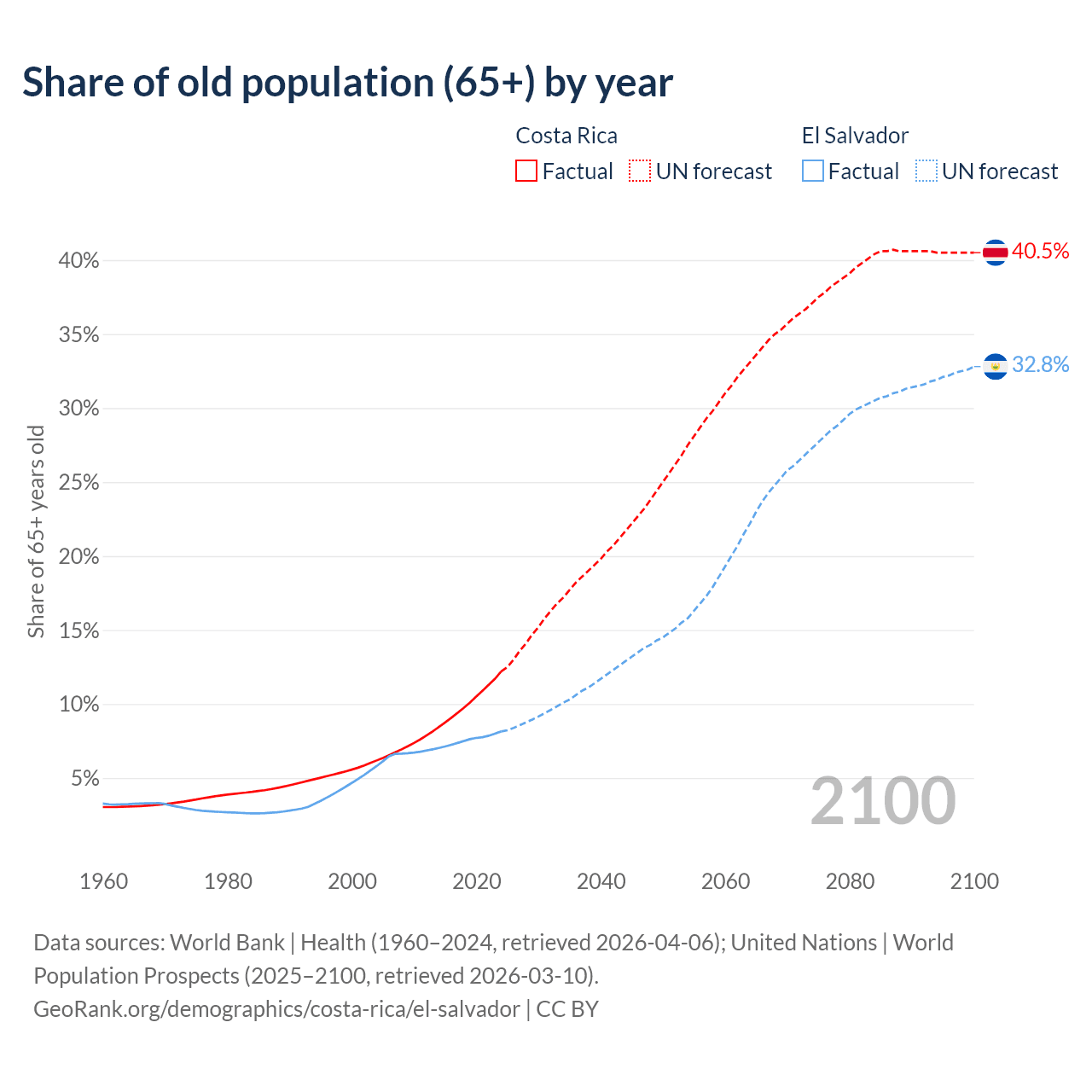 The share of older people aged 65 and over is 12.2% in Costa Rica and 8.15% in El Salvador. Life expectancy in Costa Rica compared to El Salvador .