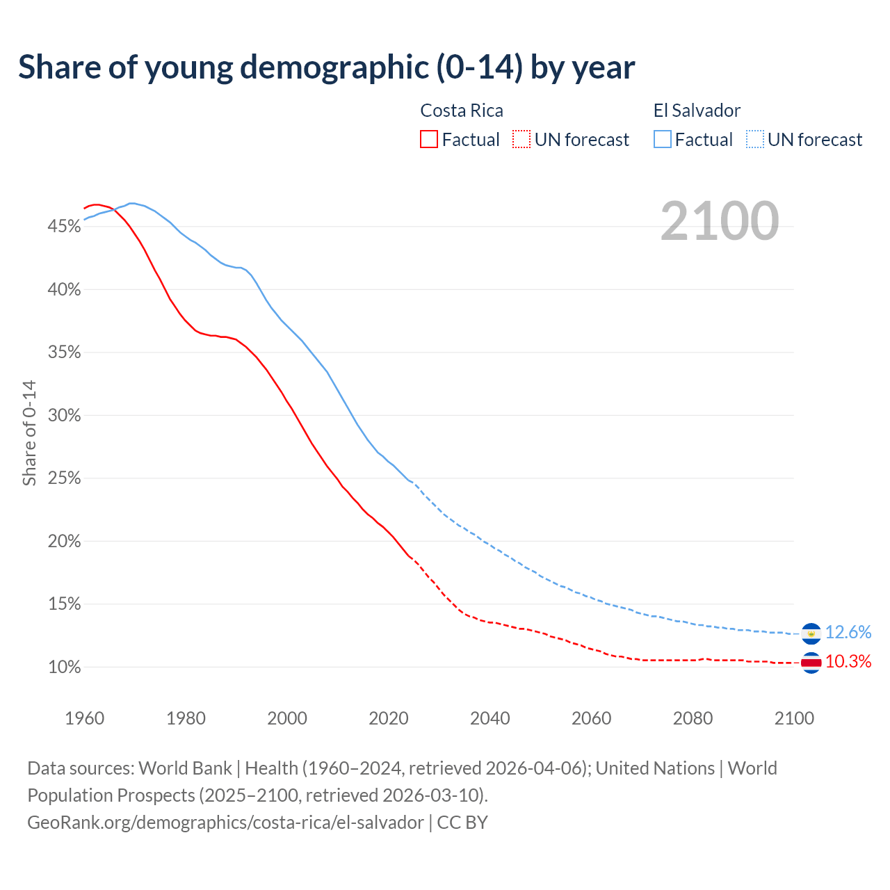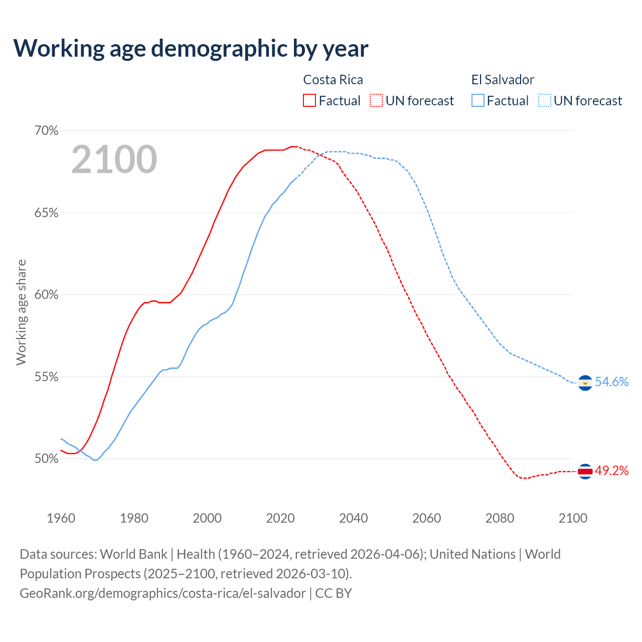 Median age Costa Rica vs El Salvador, 1960-2100