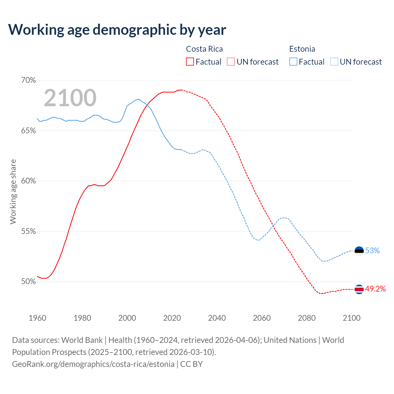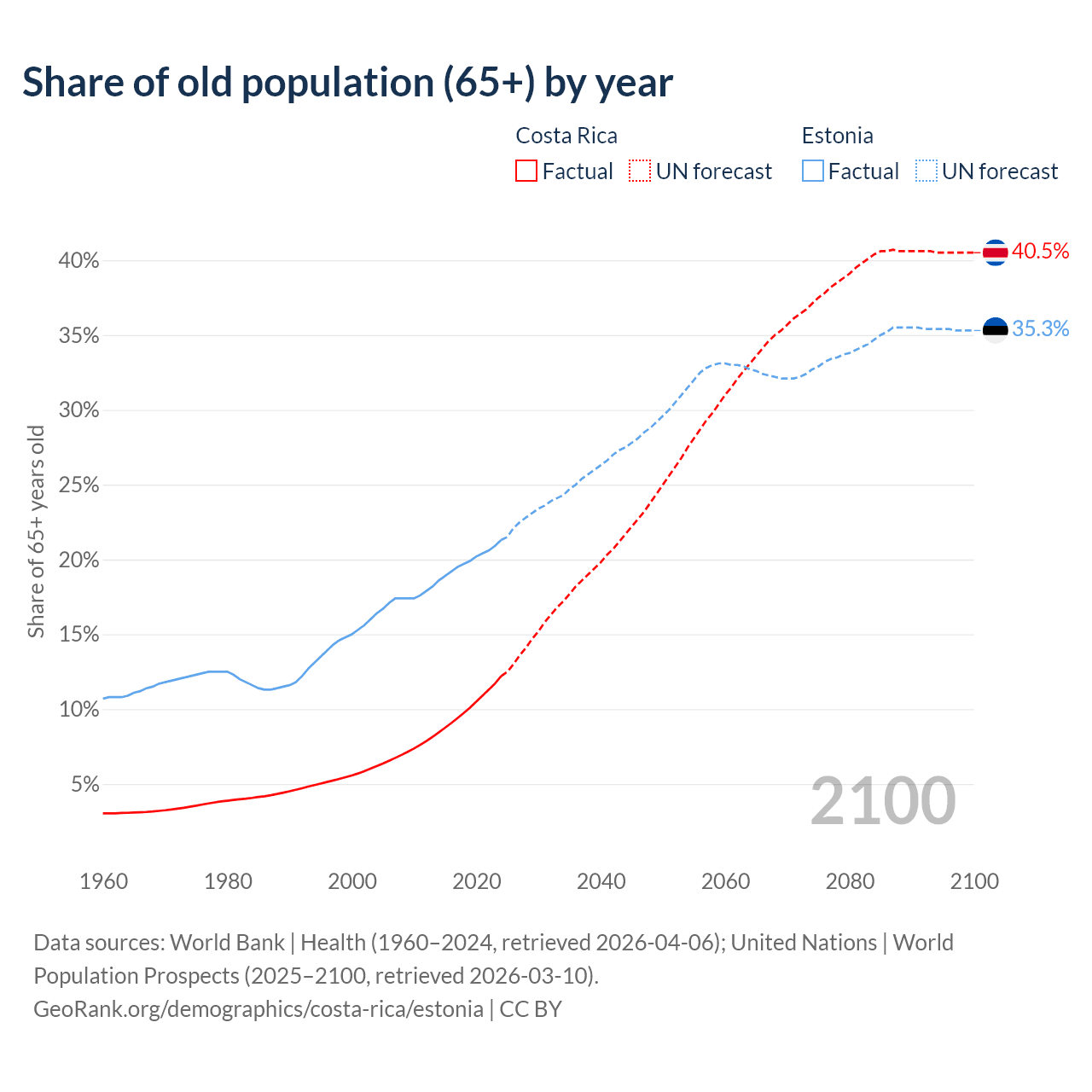 Median age Costa Rica vs Estonia, 1960-2100