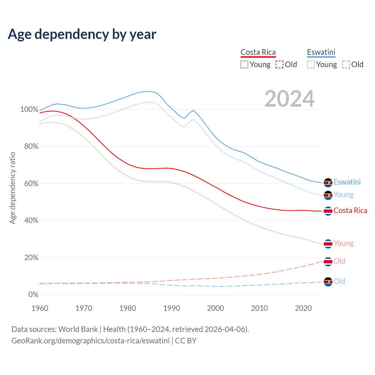 Data sources: World Bank | Health (1960–2024, retrieved 2026-04-06); U.S. Census Bureau (1960–2024, retrieved 2026-02-08).