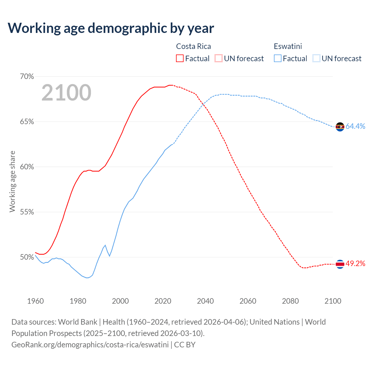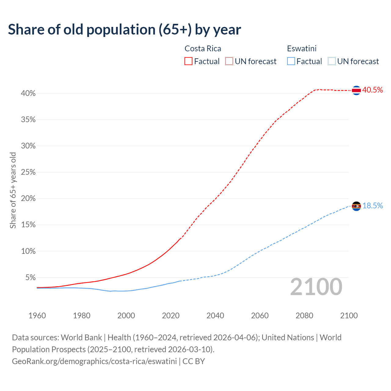Median age Costa Rica vs Eswatini, 1960-2100