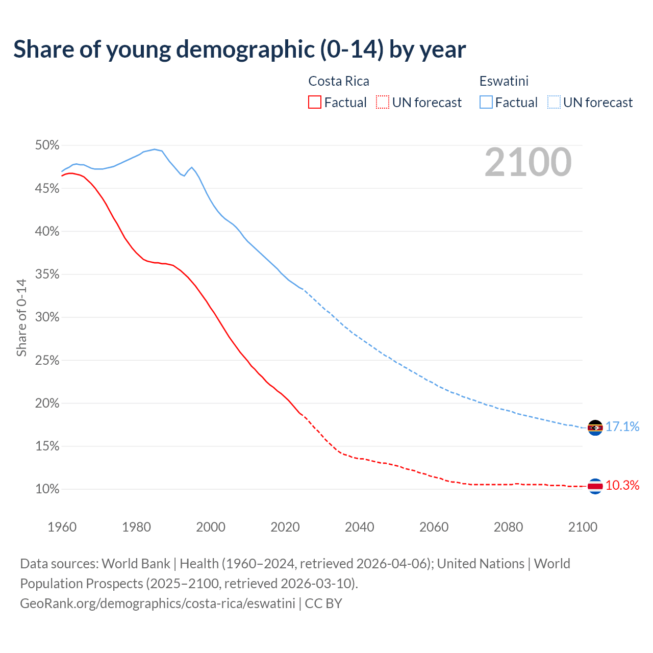 - The share of young demographic (0-15 years old) in Costa Rica is 18.8% vs 33.4% in Eswatini.