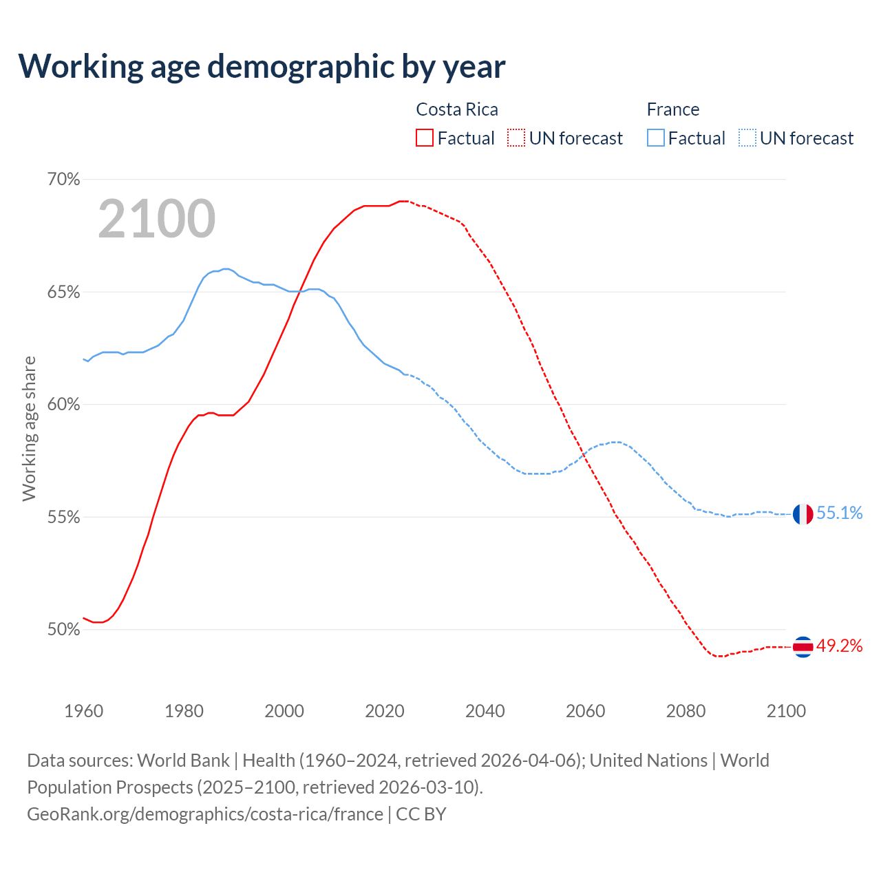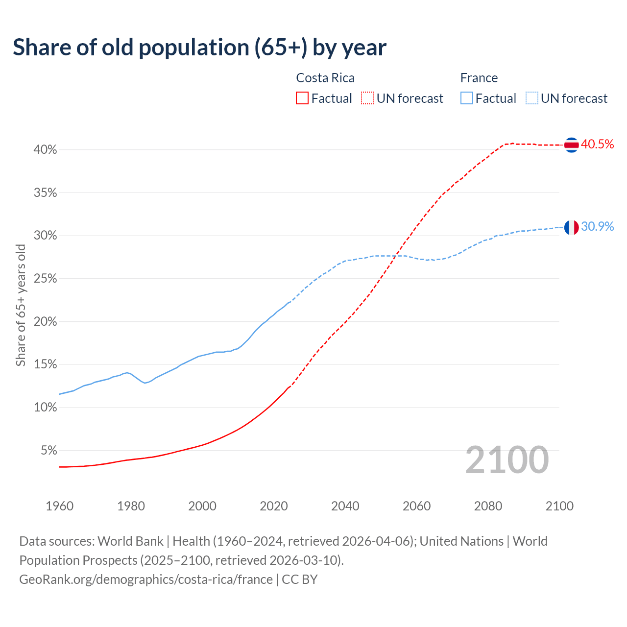 The share of older people aged 65 and over is 12.2% in Costa Rica and 22.1% in France. Life expectancy in Costa Rica compared to France .