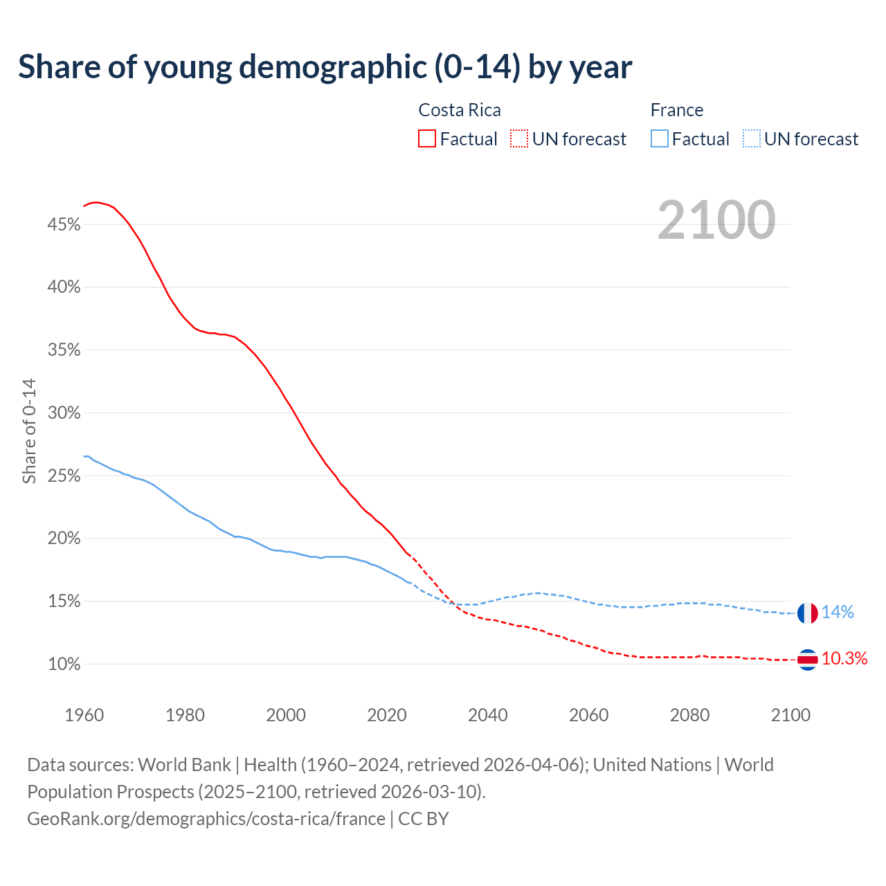 - The share of young demographic (0-15 years old) in Costa Rica is 18.8% vs 16.5% in France.