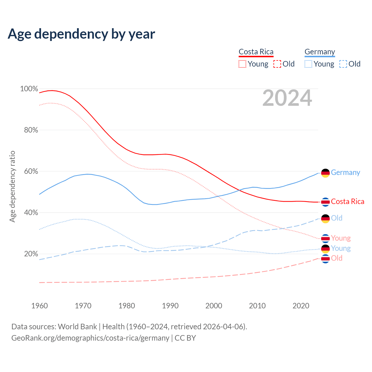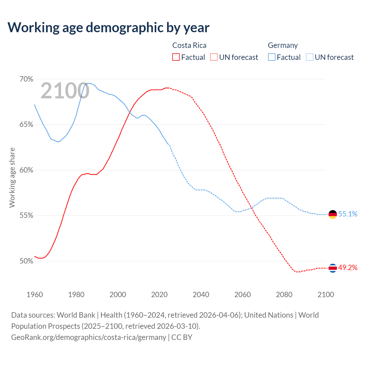 Median age Costa Rica vs Germany, 1960-2100