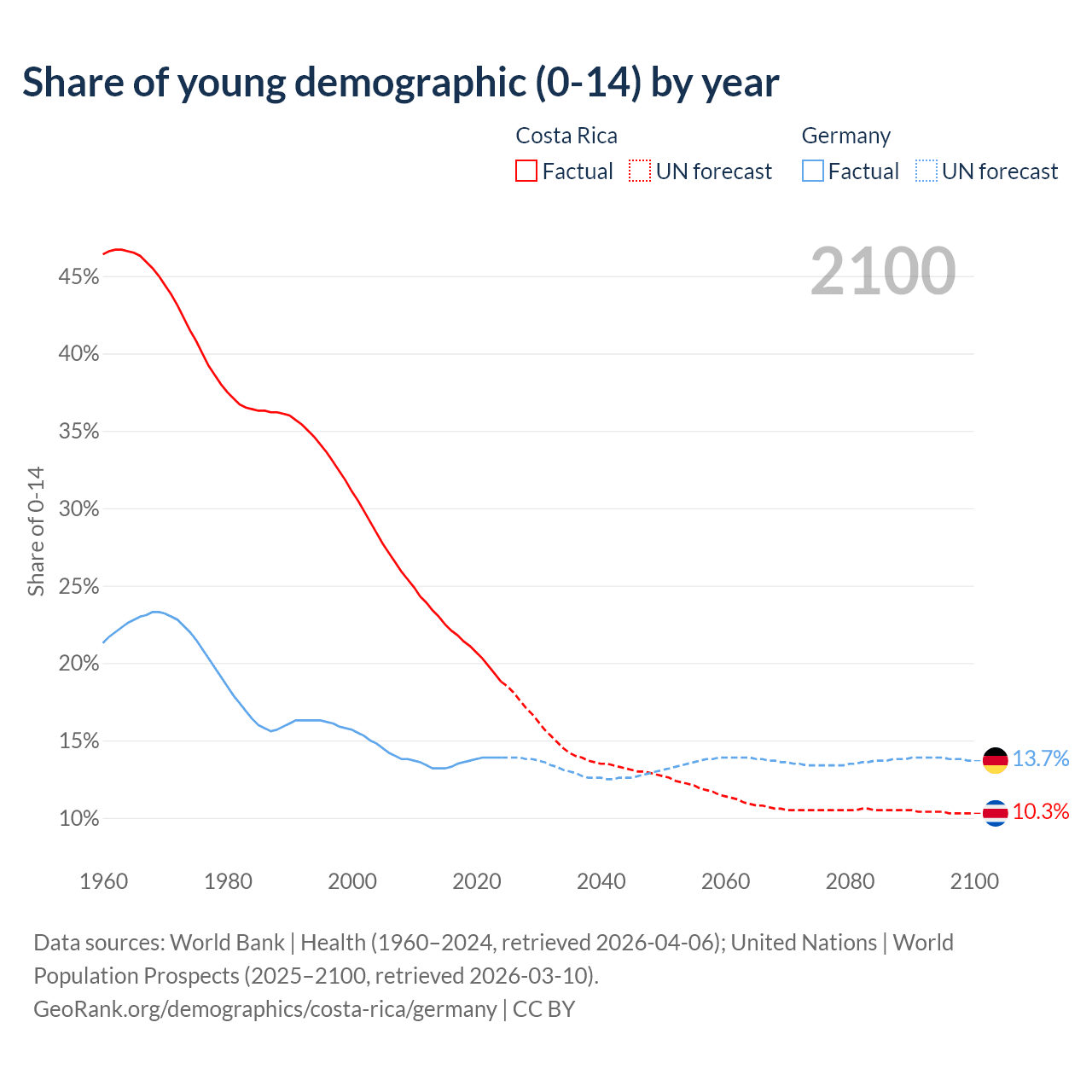 - The share of young demographic (0-15 years old) in Costa Rica is 18.8% vs 13.9% in Germany.
