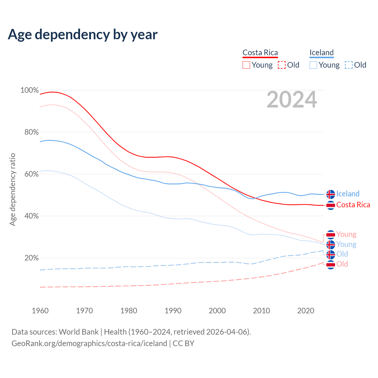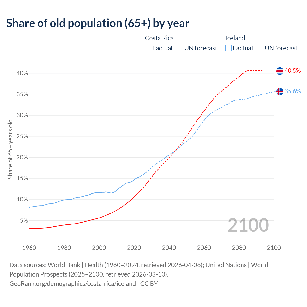 The share of older people aged 65 and over is 12.2% in Costa Rica and 15.6% in Iceland. Life expectancy in Costa Rica compared to Iceland .