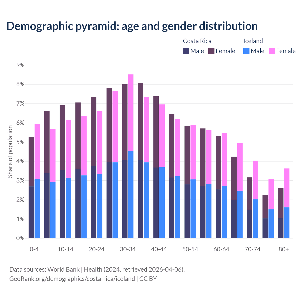 - Costa Rica is ranked 72/196 by median age (oldest to youngest) vs 65/196 for Iceland.