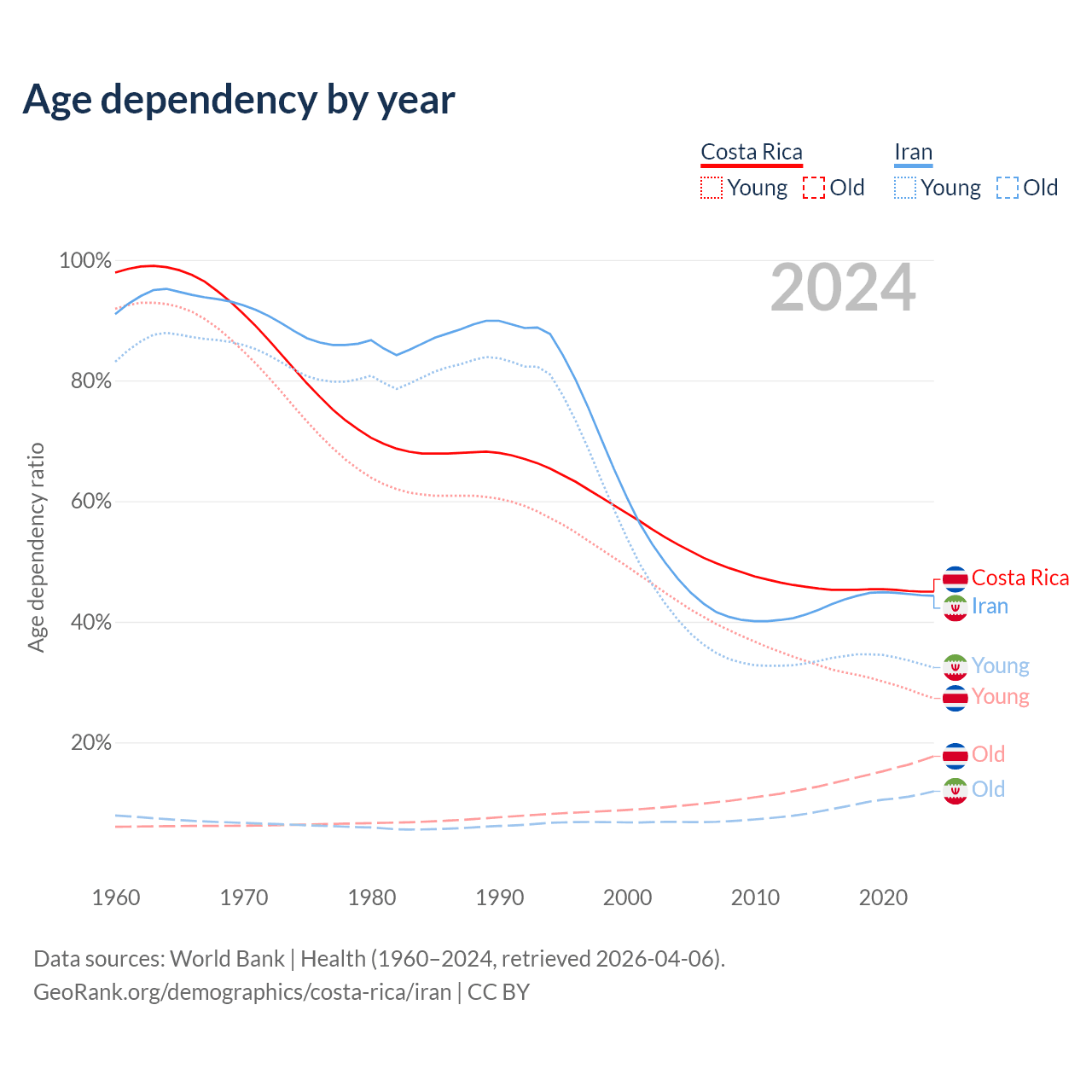 - Costa Rica is ranked 72/196 by median age (oldest to youngest) vs 79/196 for Iran.
