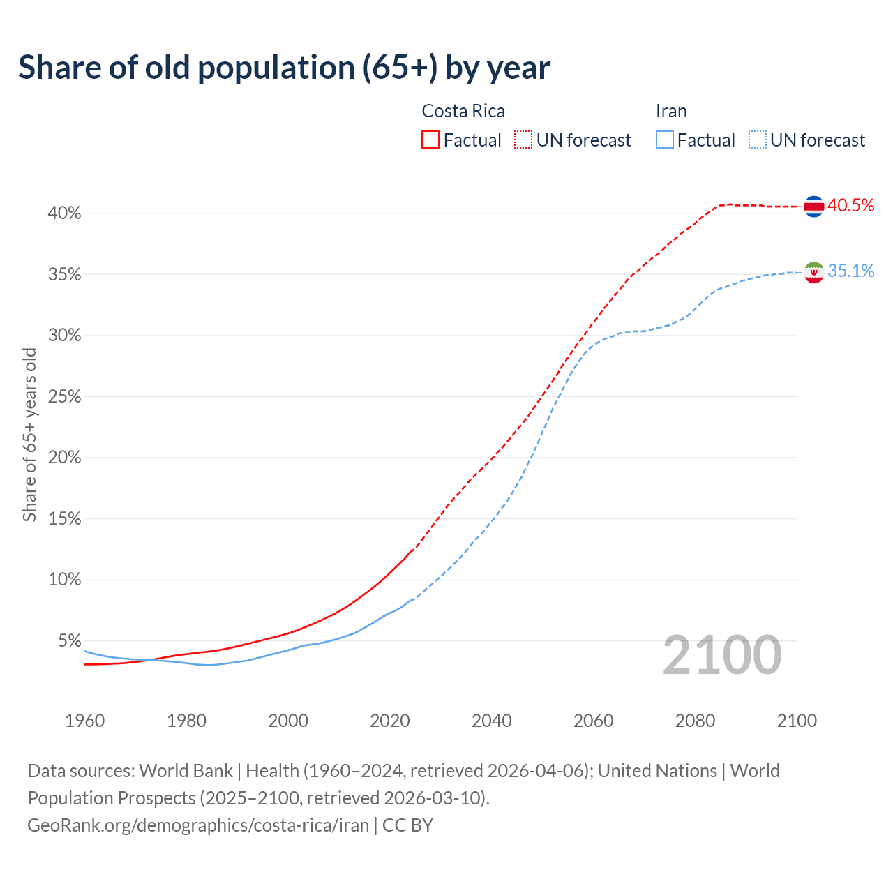 - The share of old-age demographic (65+) in Costa Rica is 12.2% vs 8.24% in Iran.