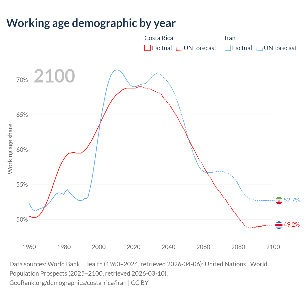 - Costa Rica has 3.57M working age adults (aged 15-64) vs 64.8M in Iran.