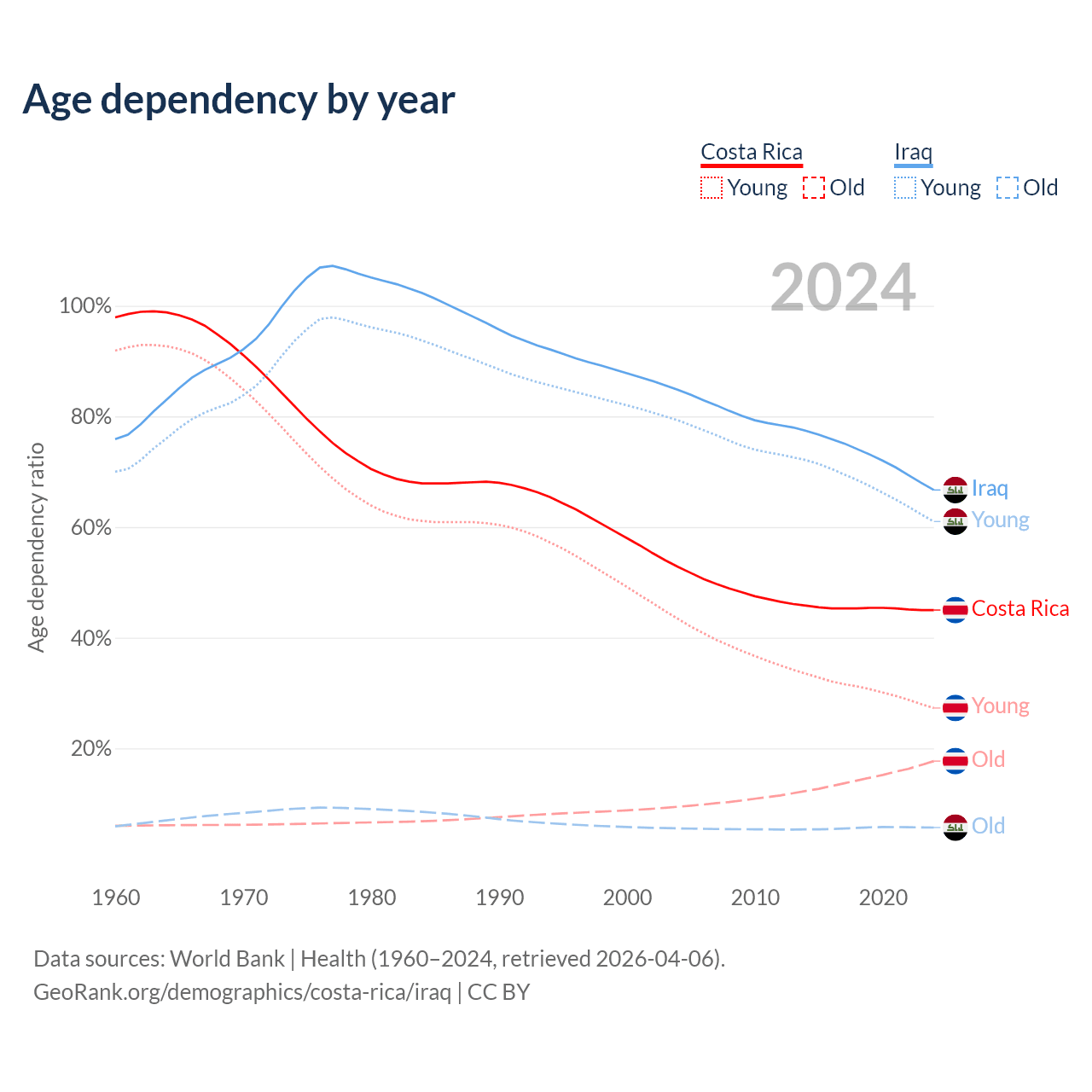 - Costa Rica is ranked 72/196 by median age (oldest to youngest) vs 151/196 for Iraq.