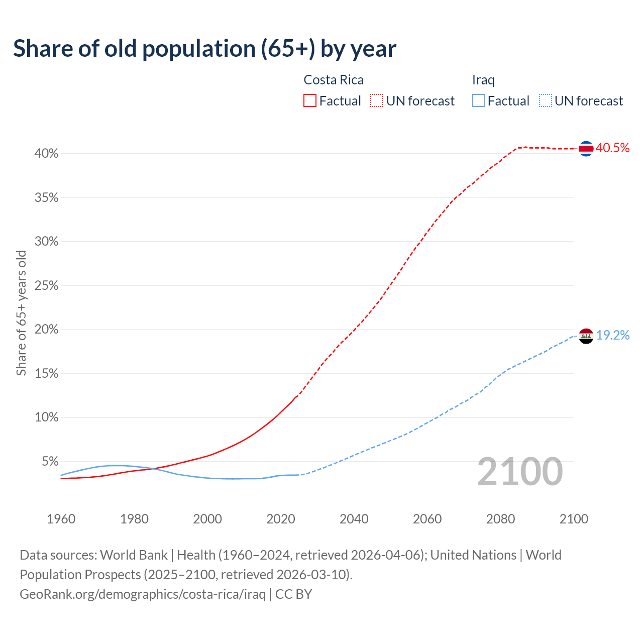 - The share of old-age demographic (65+) in Costa Rica is 12.2% vs 3.41% in Iraq.