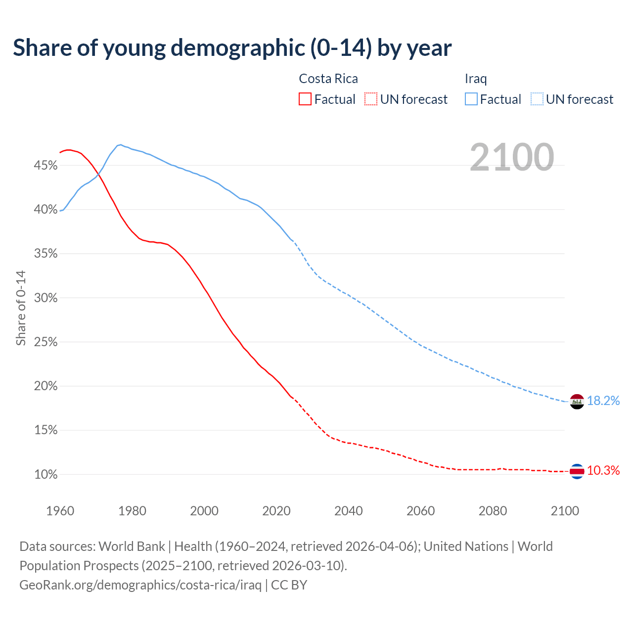 - The share of young demographic (0-15 years old) in Costa Rica is 18.8% vs 36.6% in Iraq.